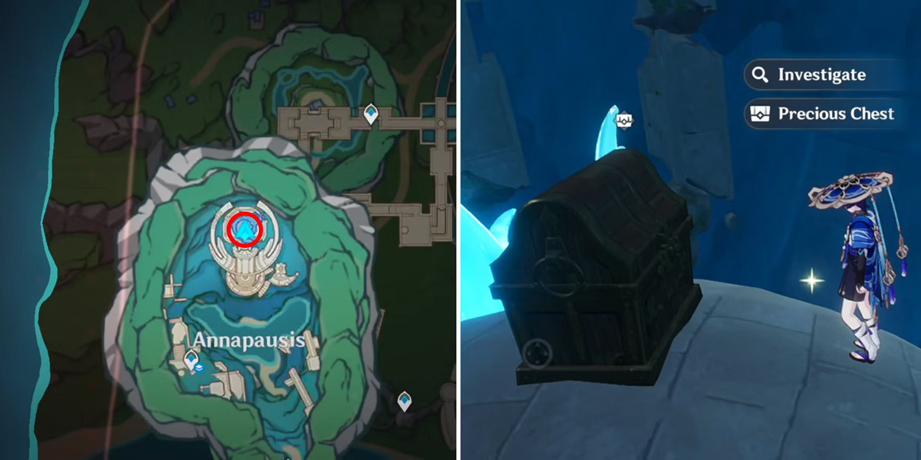 Воспользуйтесь северной точкой пути Аннапаузиса и доплывите до вершины замка, а затем нырните вниз, чтобы выбраться из воды. На вершине появится Драгоценный сундук, рядом с которым есть светящееся место, которое нужно исследовать. Исследуйте сияние, чтобы получить Загадочную страницу IX.