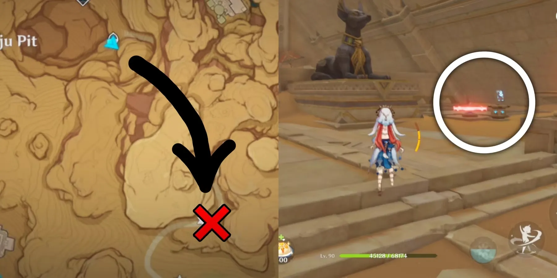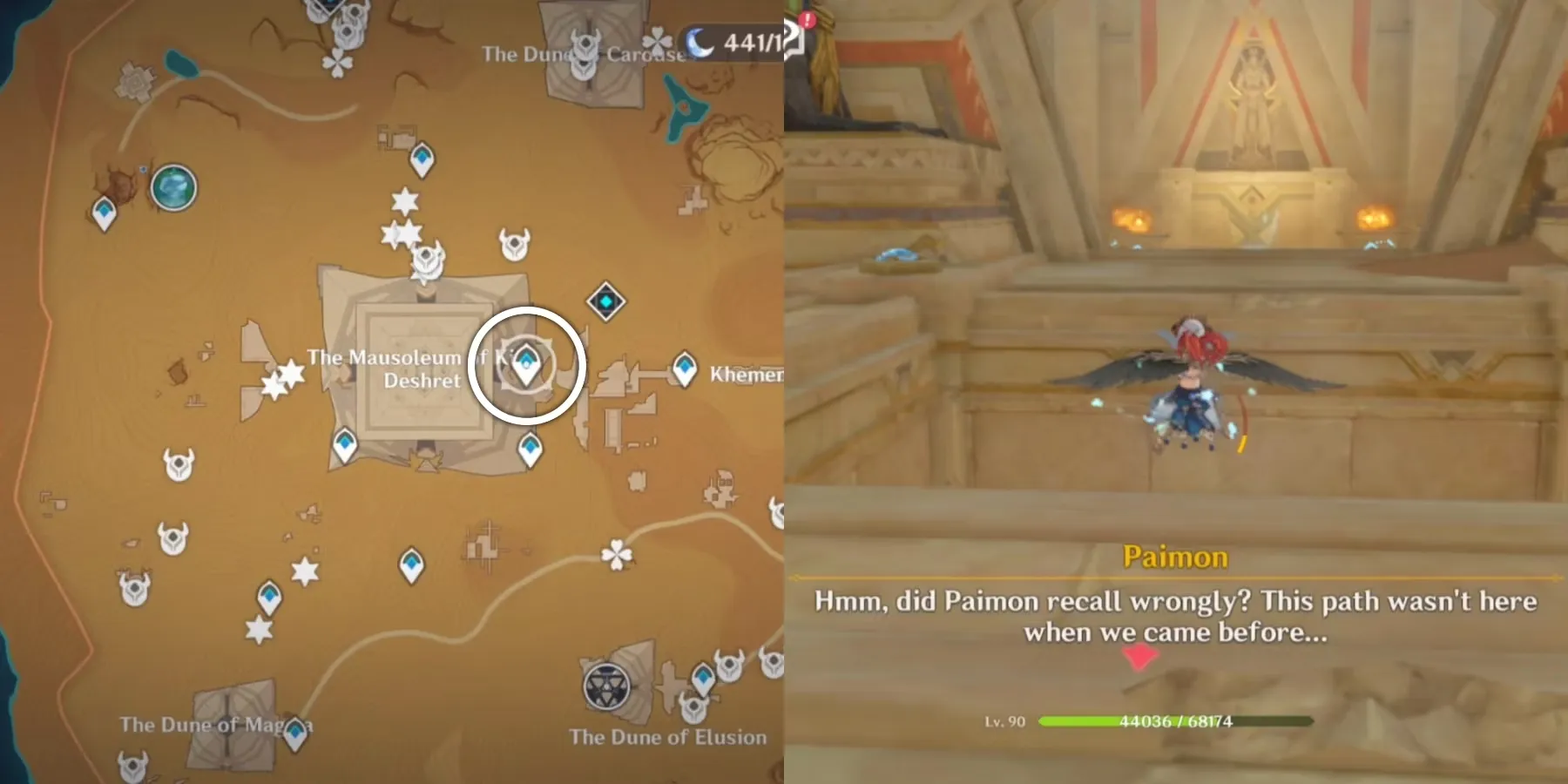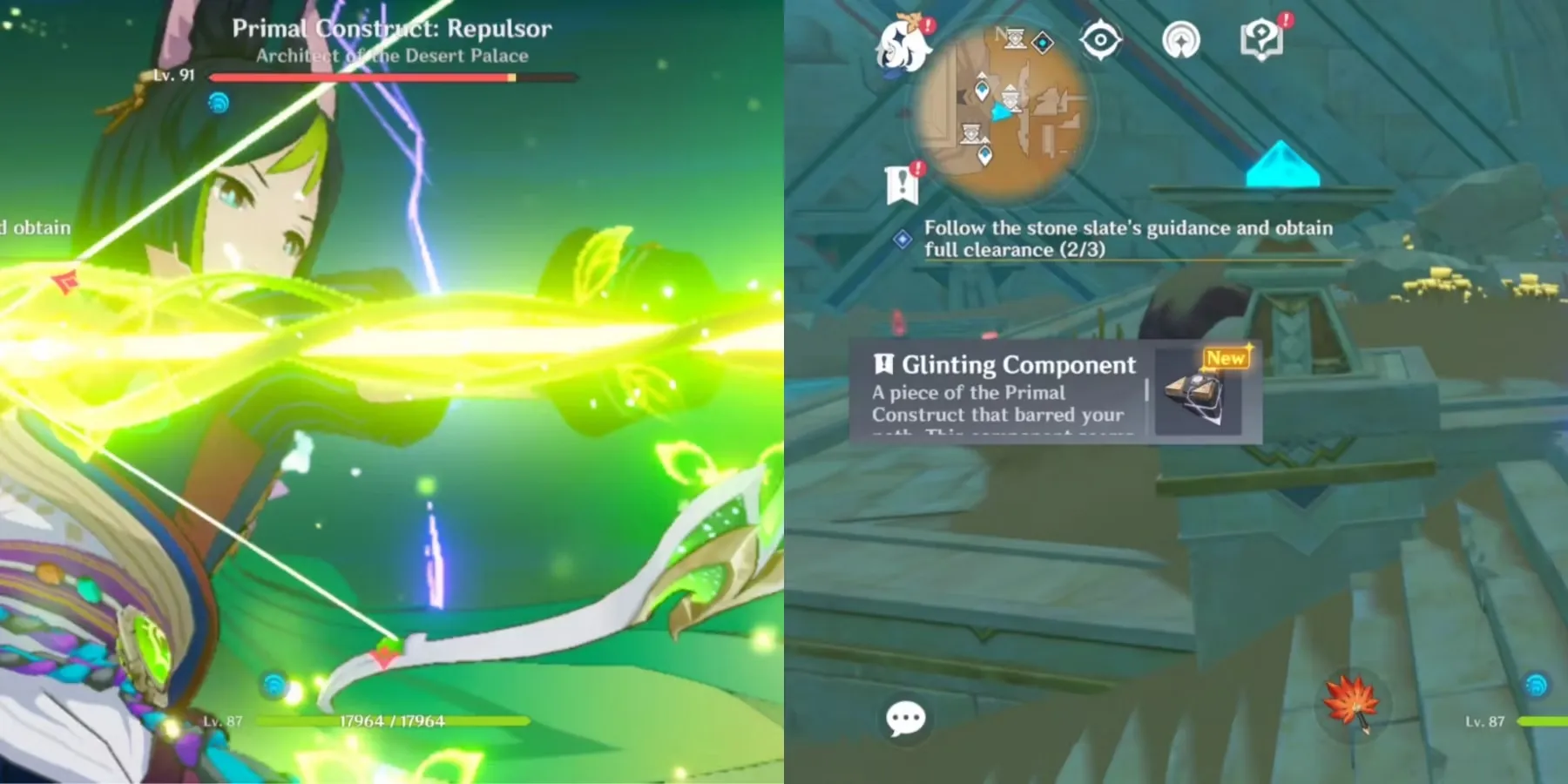 Следующее местонахождение Сверкающего компонента очень простое. Просто телепортируйтесь в точку Waypoint возле мавзолея короля Дешрета и входите в здание, пока Паймон не скажет о новом проходе. Войдите в это отверстие на полу и следуйте по нему к Primal Constructs.