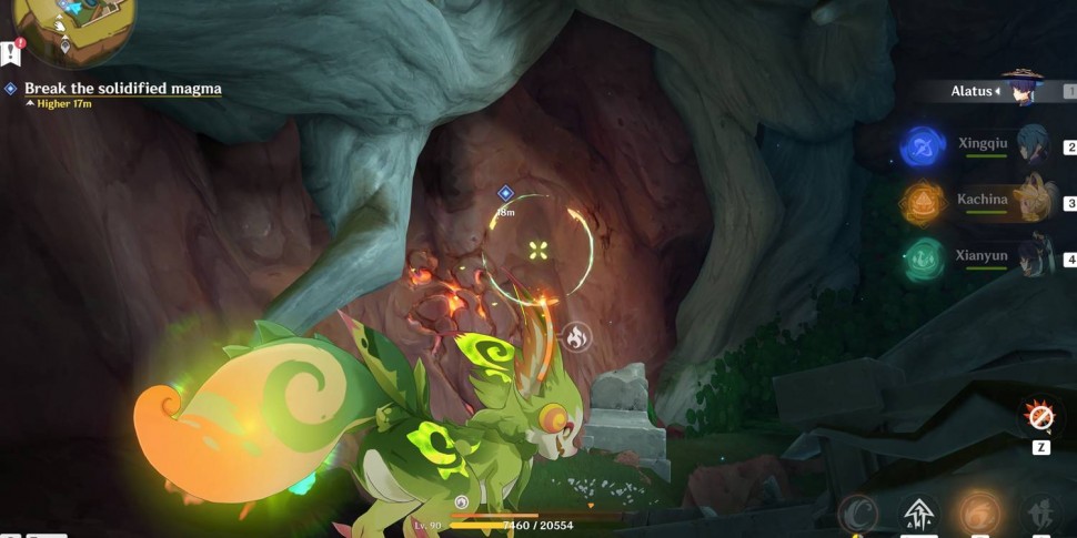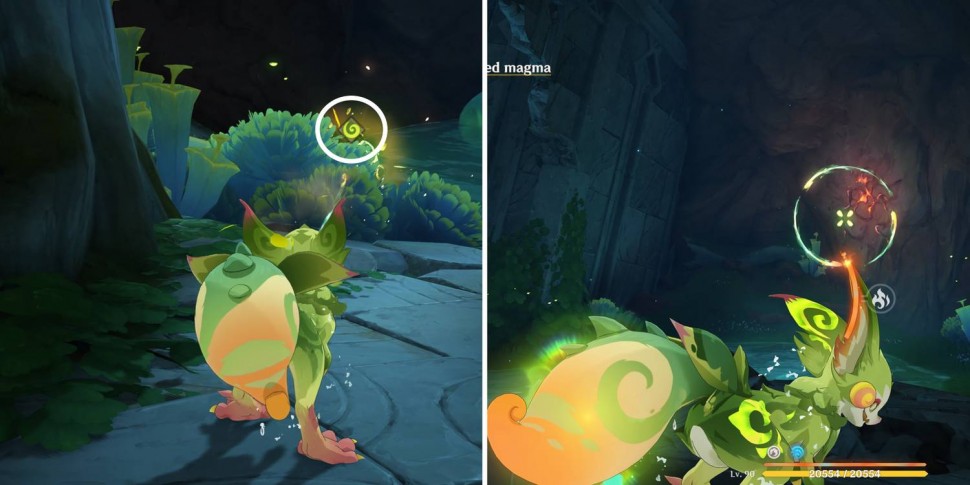 После разрушения стены уровень лавы начнет повышаться, и вам придется прокладывать себе путь наружу. Следуйте по тем же сигилам обратно, откуда вы пришли, чтобы завершить квест Ripe For Trouble и получить достижение For the Fairest в Genshin Impact. После выполнения квеста выйдите из пещеры и найдите Поку рядом с деревом. Завяжите с ней разговор, чтобы получить деньги, которые она обещала заплатить.