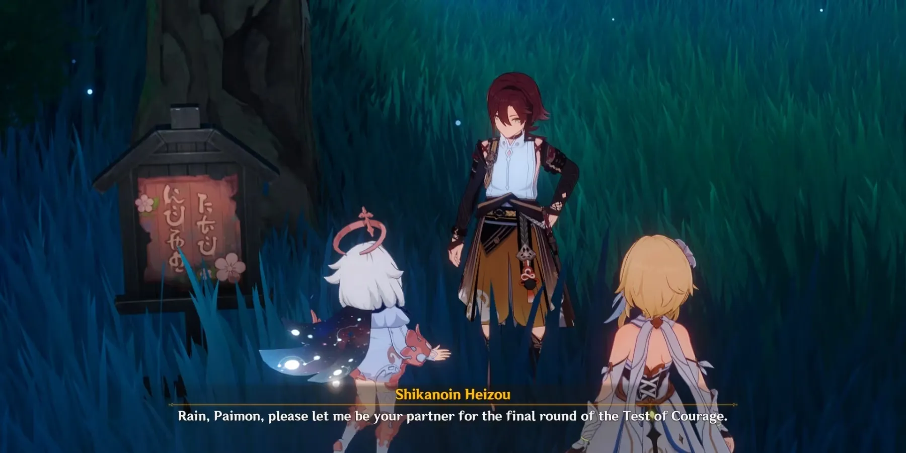 Во время предыдущих раундов "Испытания мужества" в Genshin Impact у игроков была возможность выбрать себе партнера. В третьем раунде Heizou предлагает себя и просит Путешественников сопровождать его, чтобы они могли разгадать эту загадку. Есть три основных места, которые детектив хочет обыскать: район, где игроки впервые столкнулись с призраком, район, где напуганы подчиненные Итто, и пляж.