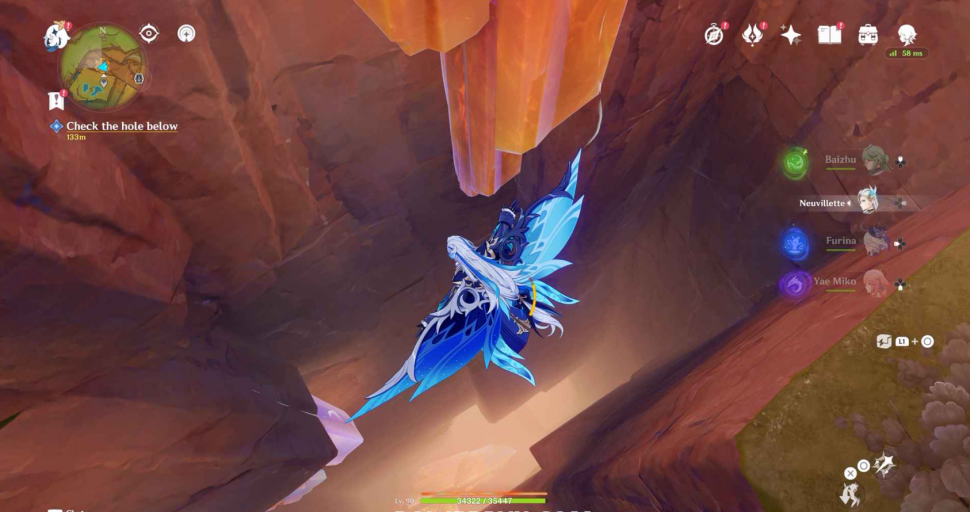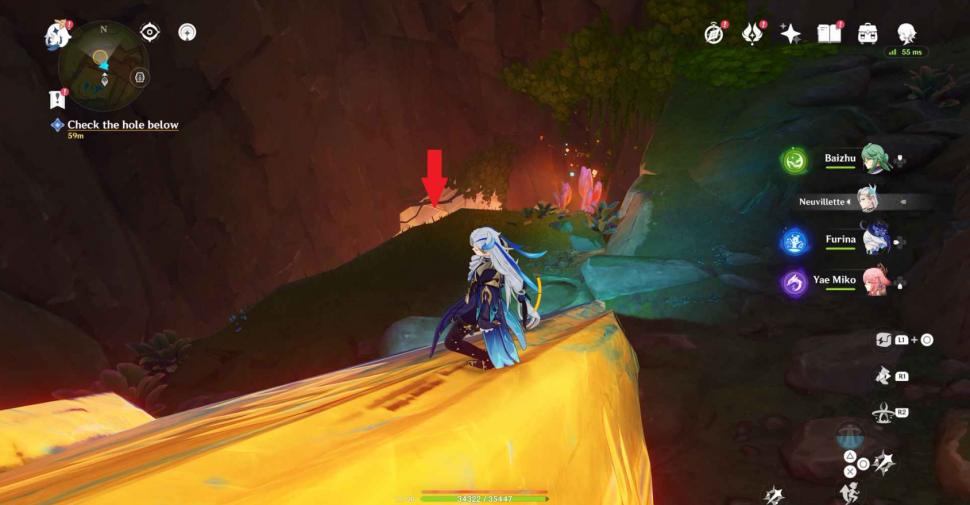 Прыгайте вниз по большому отверстию, пока не доберетесь до кристалла, пробившего поверхность.