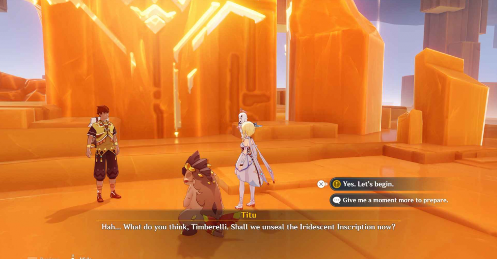 Естественно, Путешественник хочет помочь. Здесь вам дается два варианта диалога. Чтобы продолжить квест, выберите «Пойдем сейчас». Если вы хотите отвлечься, выберите «Минутку. Давайте быстро подготовимся». Выбрав этот вариант, вы сразу же отправитесь в следующий бой.