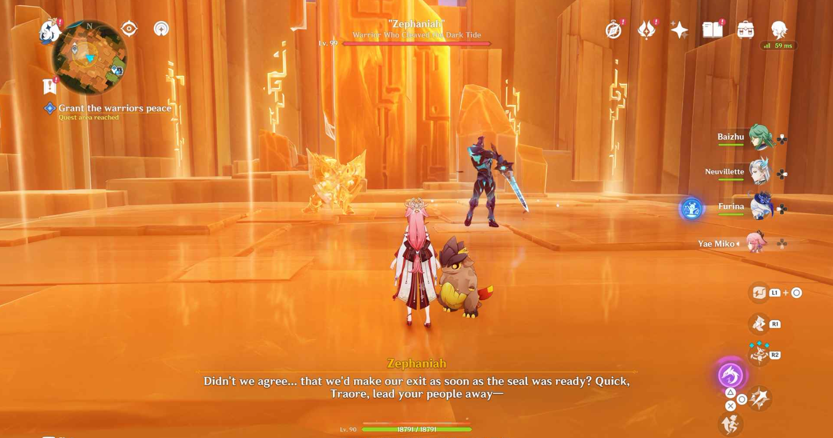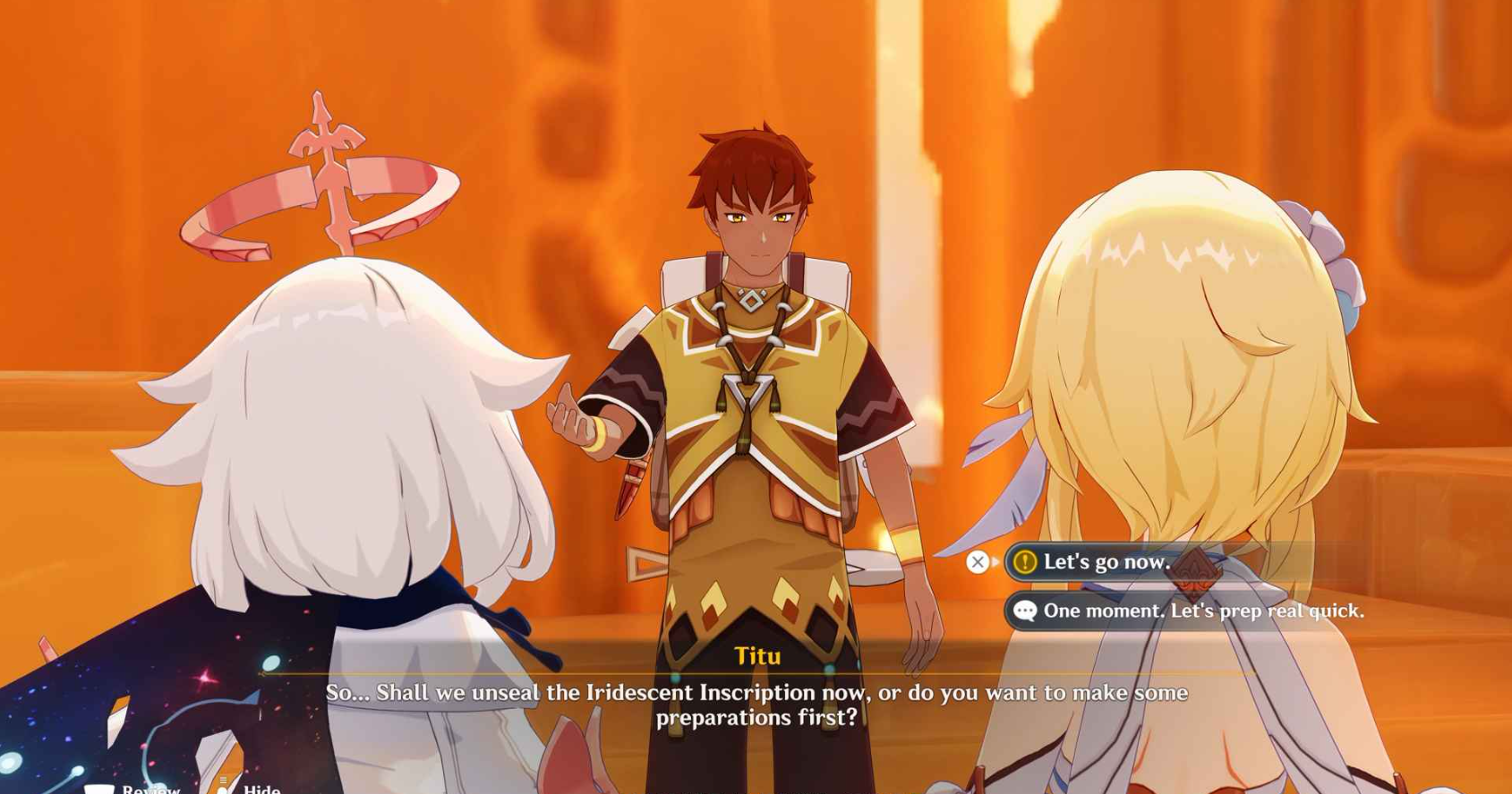 Естественно, Путешественник хочет помочь. Здесь вам дается два варианта диалога. Чтобы продолжить квест, выберите «Пойдем сейчас». Если вы хотите отвлечься, выберите «Минутку. Давайте быстро подготовимся». Выбрав этот вариант, вы сразу же отправитесь в следующий бой.