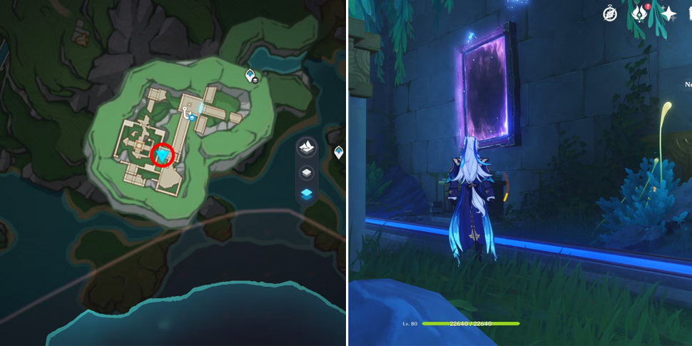 Второе Зазеркалье находится перед вертикальной подъемной колонной и механизмом Eliphas Beam в пещере Wilderness руин форта Харибда. Игроки смогут взаимодействовать с картиной во время головоломки Meteoric Lance Orthant в Genshin Impact.