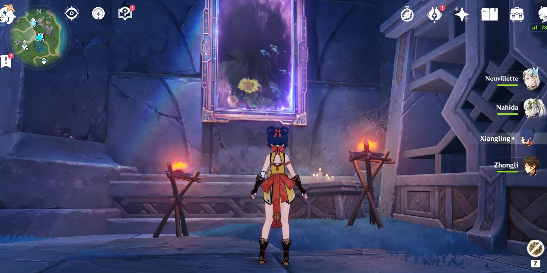 Стекло затянет игрока в неизвестное место, где он должен с помощью персонажа Pyro Genshin Impact зажечь два факела. Если это удастся, то Красный Мудрец попадет в картину с подсолнухами.