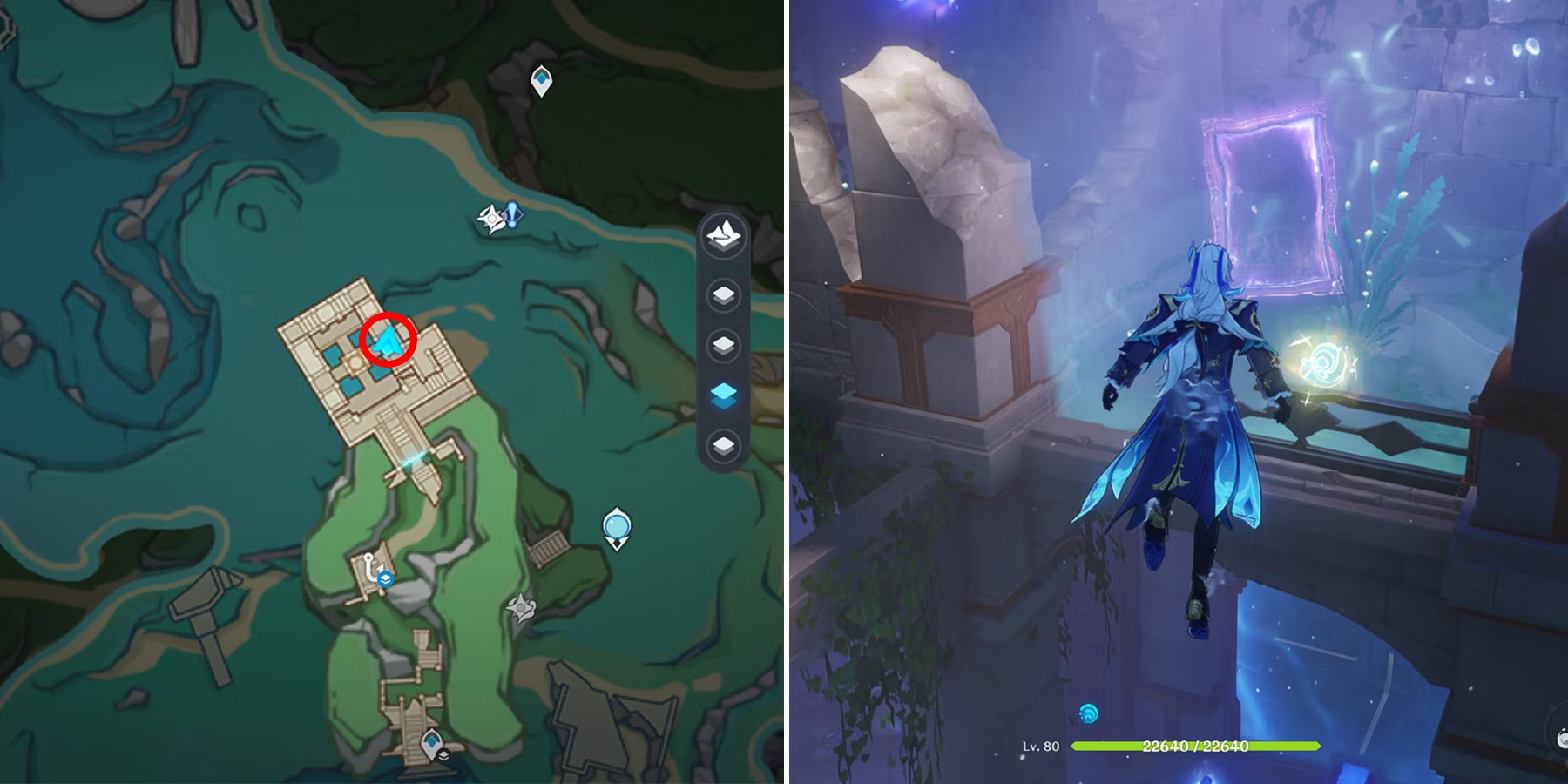 Последнее Зазеркалье находится в южной части Нижнего этажа Башни Ипсиссимуса. Чтобы найти его, быстро переместитесь к точке пути над башней и нырните вниз ко входу в нижний этаж. Далее взаимодействуйте с Зазеркальем и плавайте вокруг невидимых барьеров, чтобы получить Изысканный сундук и начать квест "Сквозь Зазеркалье" в Genshin Impact.