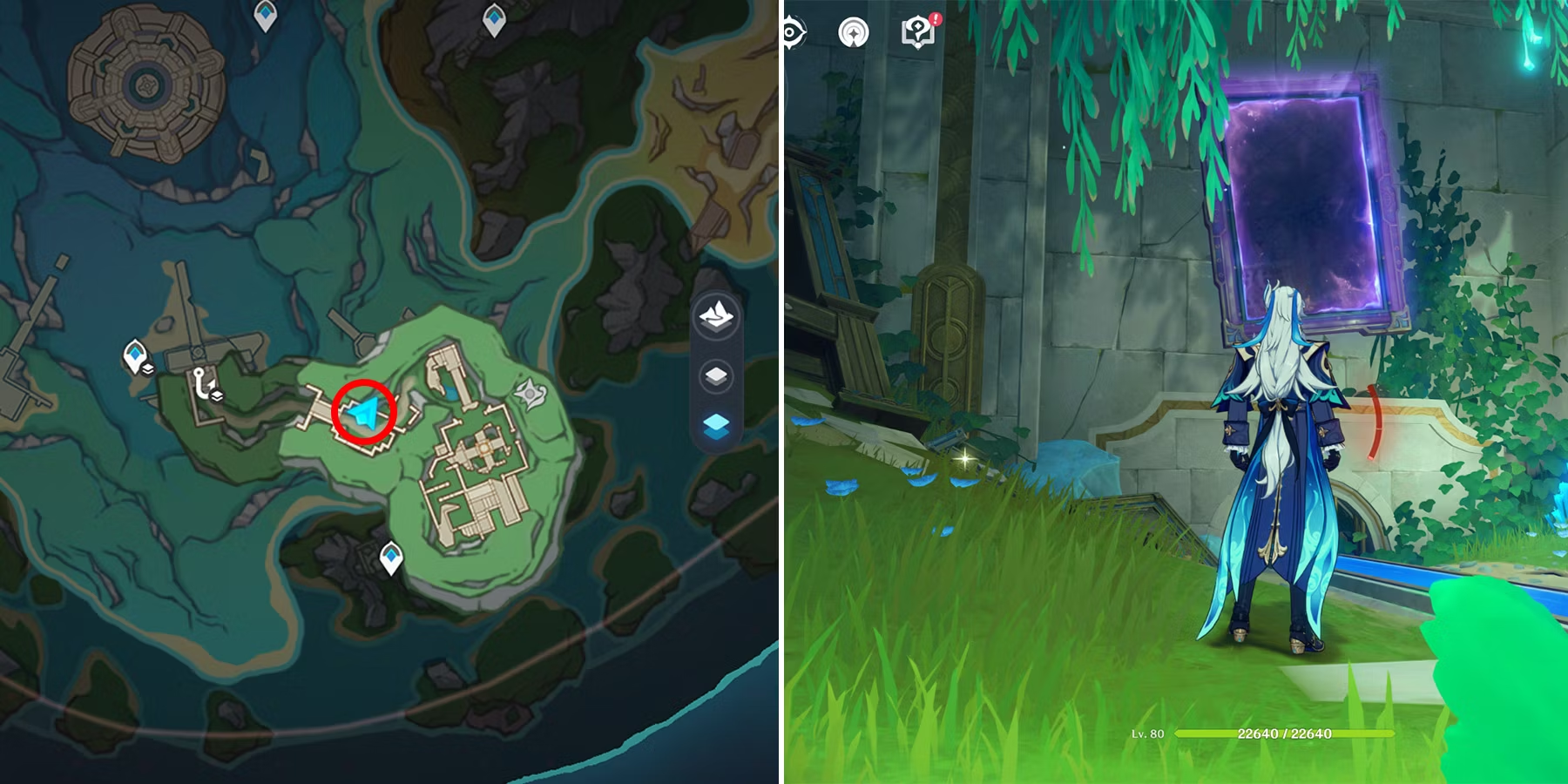 Второе Зазеркалье находится перед вертикальной подъемной колонной и механизмом Eliphas Beam в пещере Wilderness руин форта Харибда. Игроки смогут взаимодействовать с картиной во время головоломки Meteoric Lance Orthant в Genshin Impact.