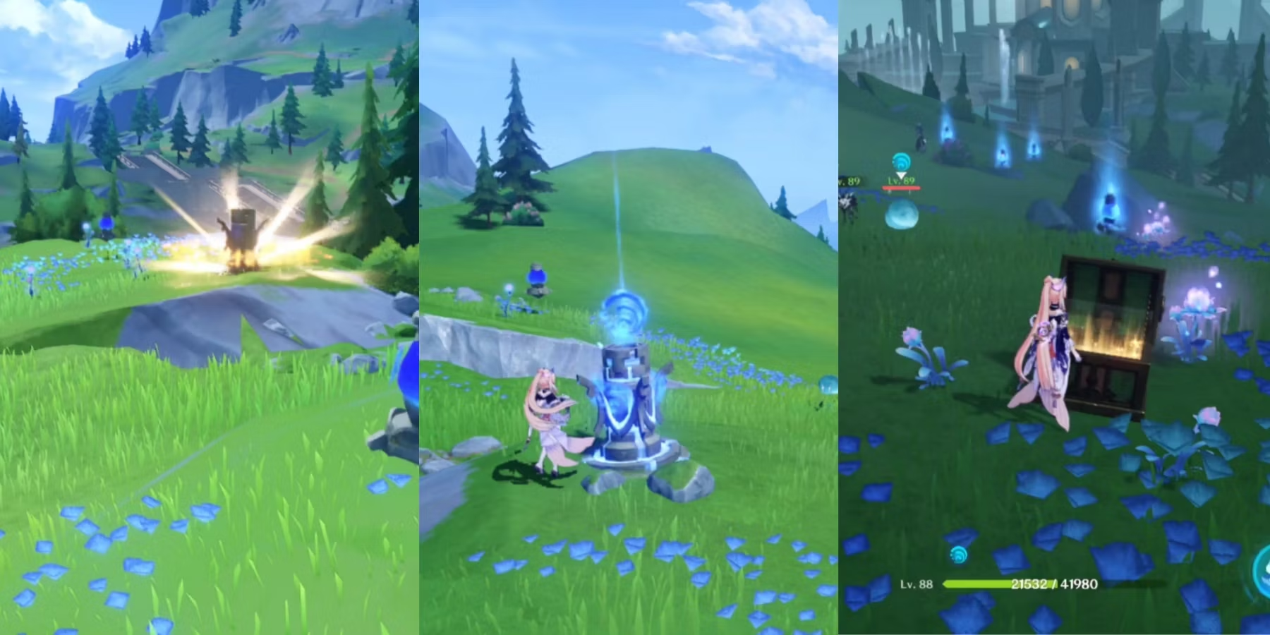 Когда все три головоломки будут решены, начнется небольшая сценка, показывающая, что гидромонумент в центре теперь разблокирован. Ударьте по нему Hydro, и в окрестностях начнется дождь, активирующий кристаллы обнаружения объема воды, которые ранее было трудно активировать.