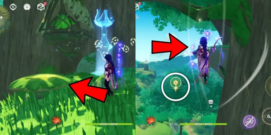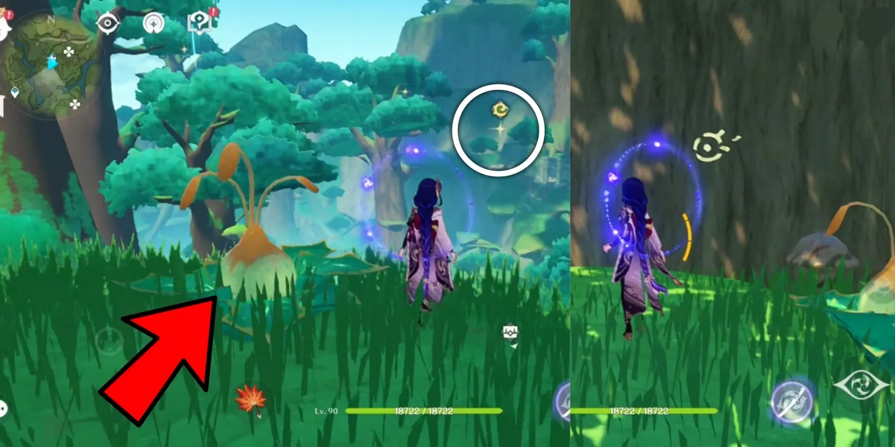 На верхнем уровне (отмеченном красной стрелкой) игроки могут найти Кластерный лист и ветвь Дендрограны. Призовите Дендрограну, а затем следуйте по Четырехлистнику к платформе напротив текущего дерева. Гриб спрятан за камнем, который можно разрушить с помощью Дендрограны.