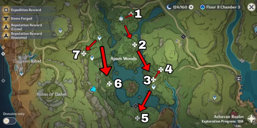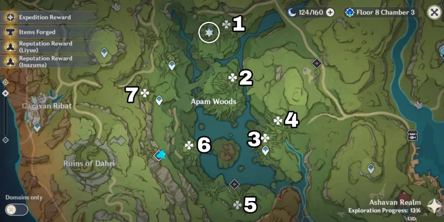 В лесу Апам есть загадка, в которой игрокам Genshin Impact тоже нужно зажечь несколько рисунков. Как и в случае с лесом Мавтиима, здесь игроков также ждет роскошный сундук.