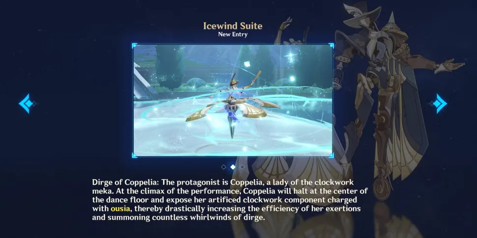 После выхода Genshin Impact 4.0 игроки получили возможность исследовать Фонтейн и сразиться с боссами Icewind Suite. Боссы Dirge of Coppelia и Nemesis of Coppelius танцуют вместе на арене и роняют различные материалы в зависимости от того, с каким боссом игроки решили сразиться. Из Dirge of Coppelia выпадает Artificed Spare Clockwork Component - Coppelia, а Nemesis of Coppelius дает Artificed Spare Clockwork Component - Coppelius.