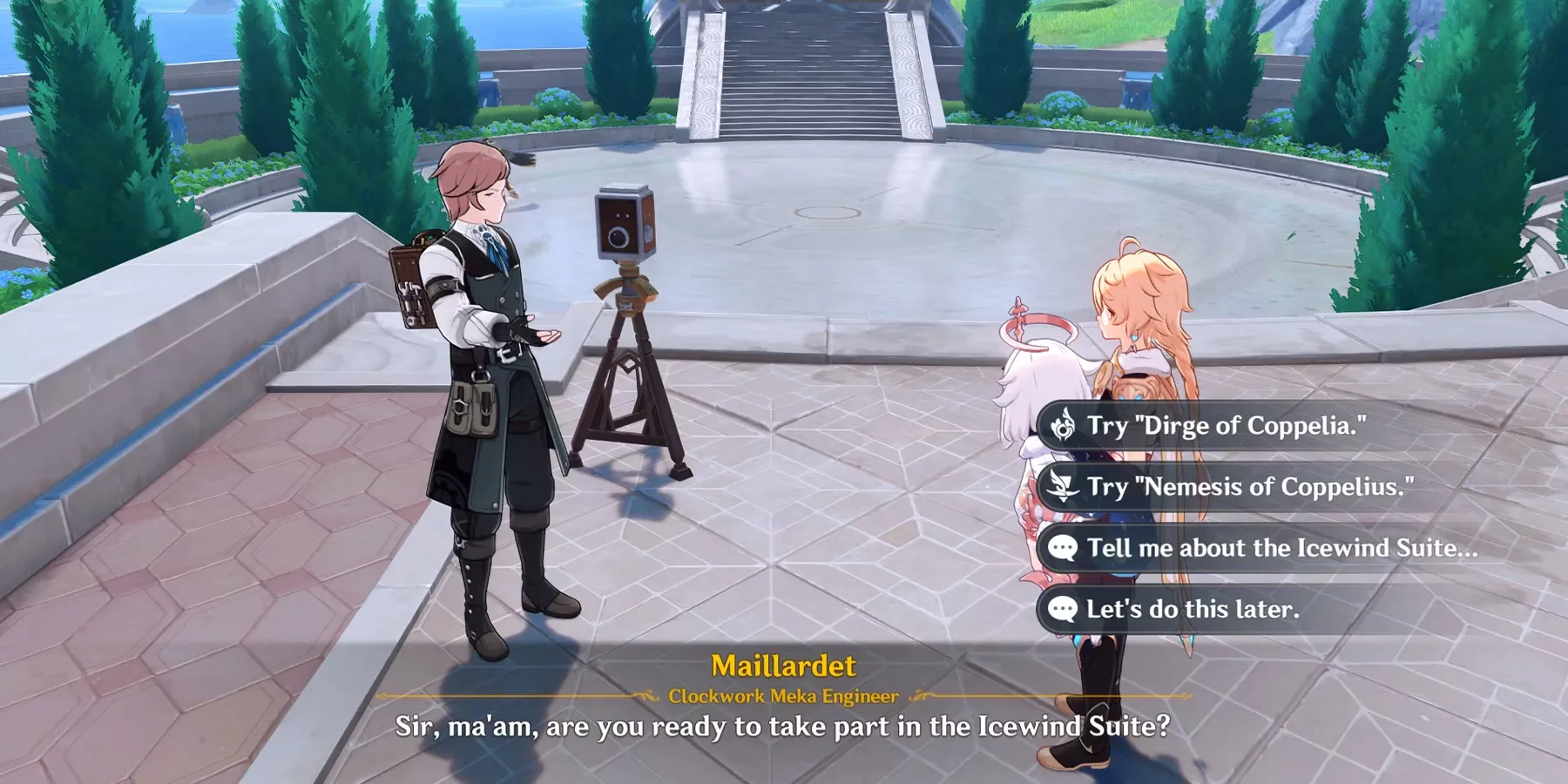 После выхода Genshin Impact 4.0 игроки получили возможность исследовать Фонтейн и сразиться с боссами Icewind Suite. Боссы Dirge of Coppelia и Nemesis of Coppelius танцуют вместе на арене и роняют различные материалы в зависимости от того, с каким боссом игроки решили сразиться. Из Dirge of Coppelia выпадает Artificed Spare Clockwork Component - Coppelia, а Nemesis of Coppelius дает Artificed Spare Clockwork Component - Coppelius.