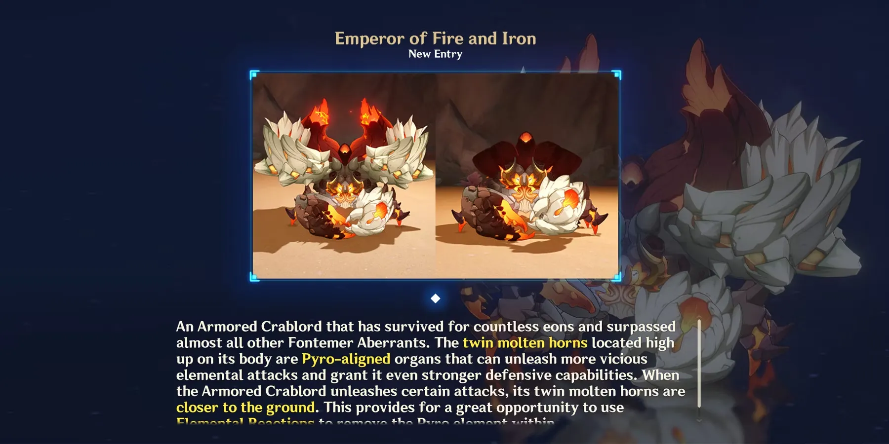 Главной особенностью Императора Огня и Железа является его Пирощит, который повышает сопротивление краба и помогает ему поглощать большую часть поступающего урона. Чтобы победить Императора Огня и Железа в Genshin Impact, игроки могут обратиться к этому руководству, в котором собраны основные сведения, а также некоторые советы, которые помогут сделать бой с боссом несложным.