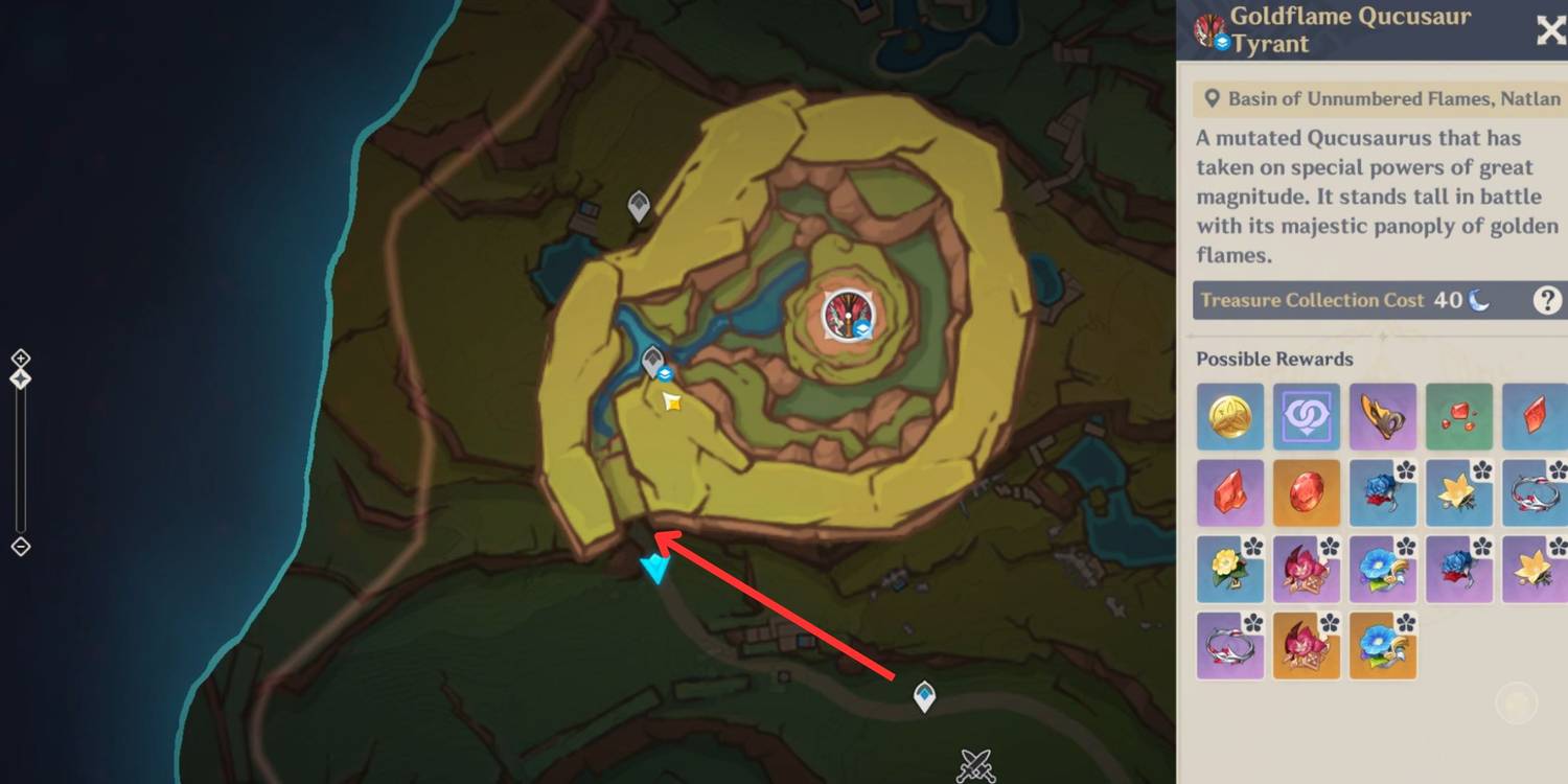 Тиран Кукузавр Золотого Пламени - новый босс в регионе Натлан в Genshin Impact. Босс находится к северу от Стадиона священного пламени, его можно найти в пещере под горами холма Хуитцли.