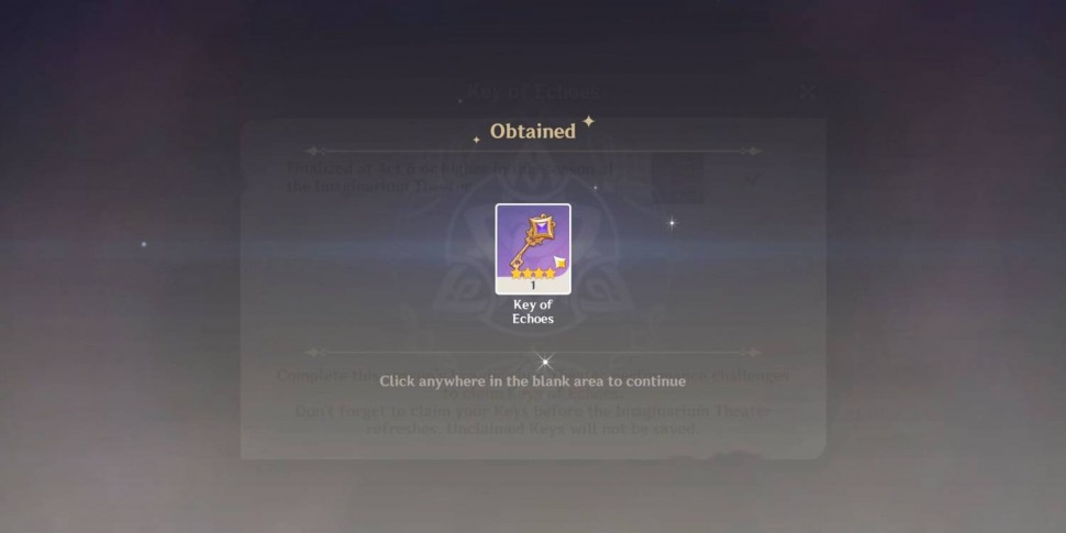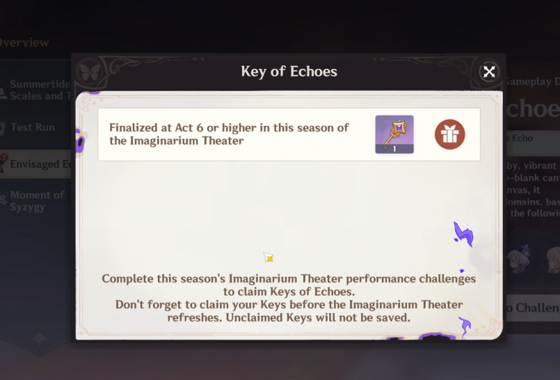 После выполнения некоторых заданий Театра Имаджинариума игроки будут получать Ключи Эхо в каждом сезоне. С помощью этих ключей вы сможете разблокировать Эхо Предвидения для указанных в списке персонажей. Игрокам потребуется по два Ключа Эха для каждого персонажа, и в каждом сезоне будет выдаваться только один ключ. Разблокировав ключ, вы должны пройти заданное испытание с этим персонажем, чтобы получить эффект тропы персонажа.