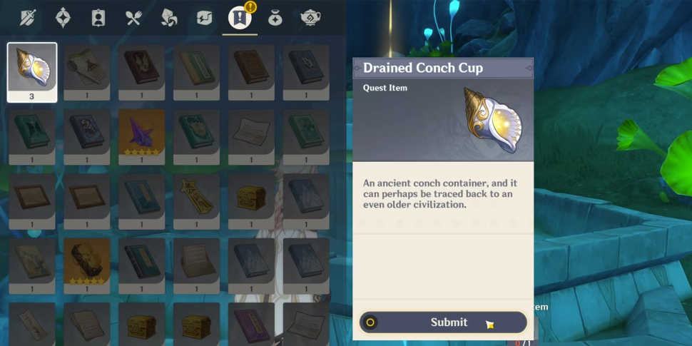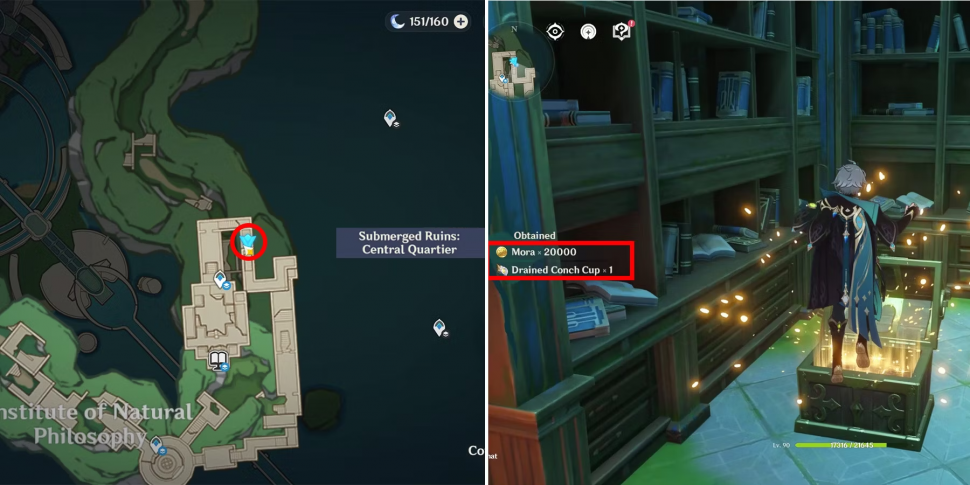 - Получите 20 000 Мора и вторую чашу с осушенным конхом.