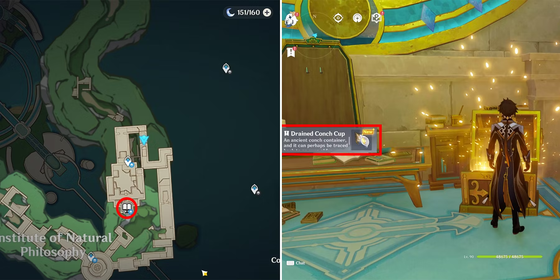 Чтобы получить вторую чашу с осушенным конхом, быстро переместитесь в северо-восточную точку пути Института натурфилософии, а затем: