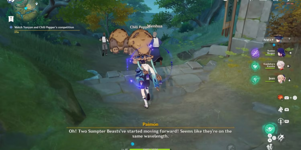 Кстати, если отпустить Юня до того, как он покончит со всеми кладоискателями, зверь-сумчатый поможет игрокам, набросившись на врагов. После того как Юнь отказывается есть чилисы "Цзюэюнь" в Genshin Impact, появляется Тушэн и читает Вэньхуа лекцию о зверях-сумчатых и их любимой еде. После ссоры, которая длилась несколько минут, обе стороны решают отправиться в лагерь Вэньхуа, где устроят соревнование, чтобы выяснить, у кого из зверей-сумчатых выше настроение.