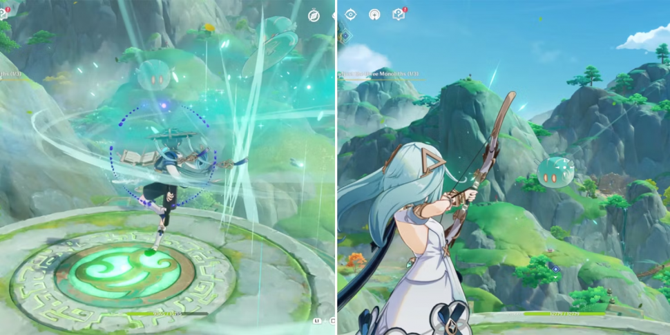 Отправляйтесь на запад от деревни Qiaoying Village, чтобы встретить монолит Anemo. Резонируйте с монолитом, чтобы вызвать легкую головоломку в Genshin Impact. Летите вверх по течению ветра и используйте энергию адепта, чтобы подтянуть платформу ближе. Поднимитесь на нее и поразите всех плавающих слизней Анемо. Активируйте адептскую энергию, чтобы переместиться на более высокую платформу и расстрелять еще больше слизней Anemo, чтобы завершить головоломку.