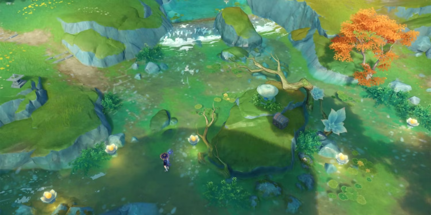 Идите на северо-запад от деревни Qiaoying Village, чтобы найти монолит Hydro, окруженный фонарями Lotus Lanterns. Взаимодействуйте с монолитом, затем исследуйте близлежащий Лотосовый фонарь, чтобы породить пару Гидрослимов в Genshin Impact. Победите их, затем подберите большой фонарь Лотоса, используя энергию адепта, чтобы на короткое время включить все окружающие фонари Лотоса. Откройте сундук и перейдите в следующую зону.