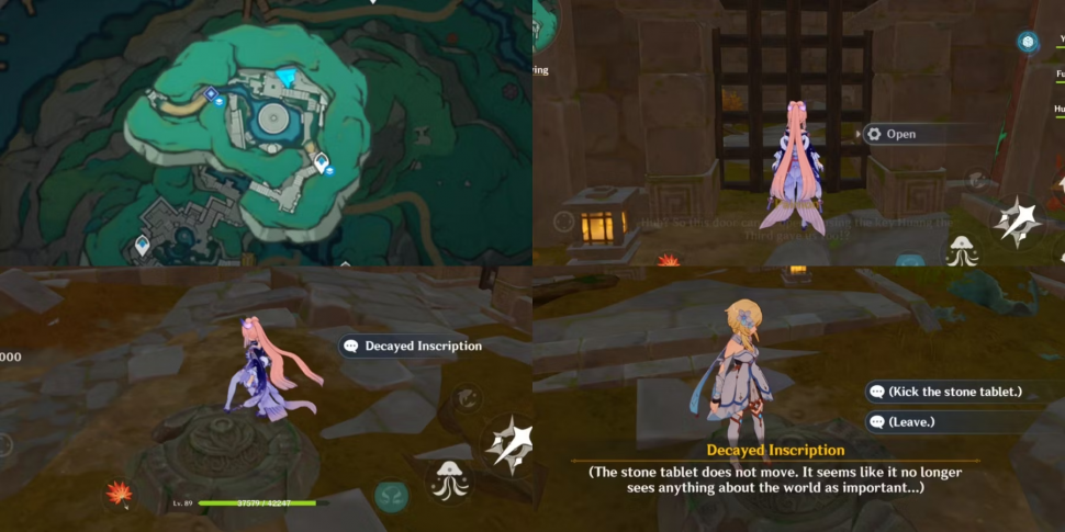 Первая надпись находится к северу от пещеры, где есть запертые ворота. К счастью, с ключом, который дал Хуанг Третий, игрокам не придется ничего делать, кроме как взаимодействовать с кнопкой открытия. Однако, так как Разрушенная надпись немного неисправна, вам придется применить немного силы, используя опцию удара. Скрижаль активируется, но взамен игроки должны победить нескольких врагов, которые появляются вместе с гневом надписи.