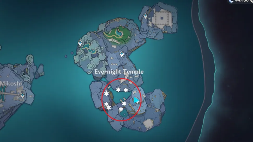 На этом этапе поиска достижений игроки захотят еще раз телепортироваться к самому южному телепорту храма Эвернайт. Два оставшихся призрака, Сурепио и Рисутайосу, будут гораздо доступнее, если подойти к ним с более высокой точки.