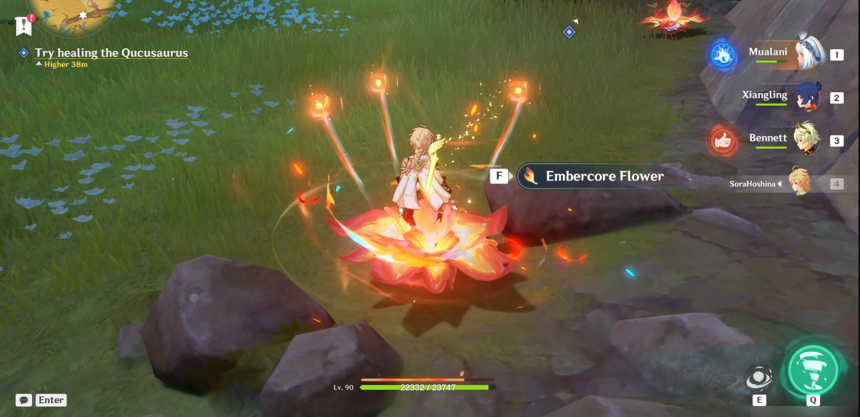 Чтобы вылечить кукузавра, атакуйте цветок эмберкоры, чтобы он расцвел, и вы сможете его исцелить. Соберите 3 цветка эмберкоры и отдайте их кукузавру, чтобы вылечить его и завершить квест.