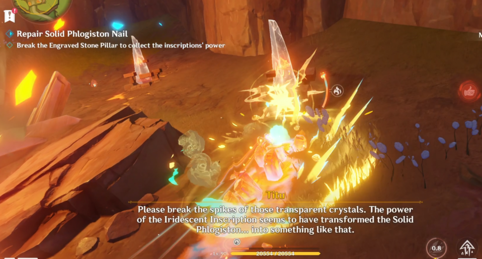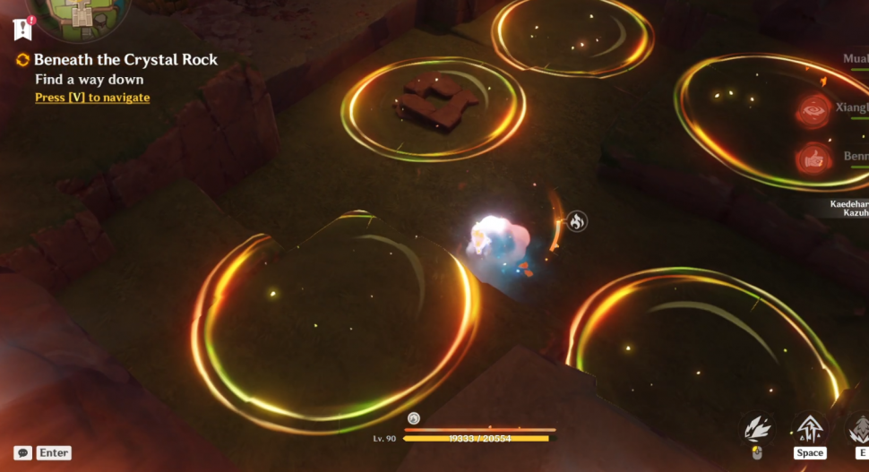 Пройдите через это отверстие и взорвите кристаллы нестабильного флогистона (маленькие кристаллы на земле), чтобы взорвать небольшой проход и еще больше понизить уровень воды.