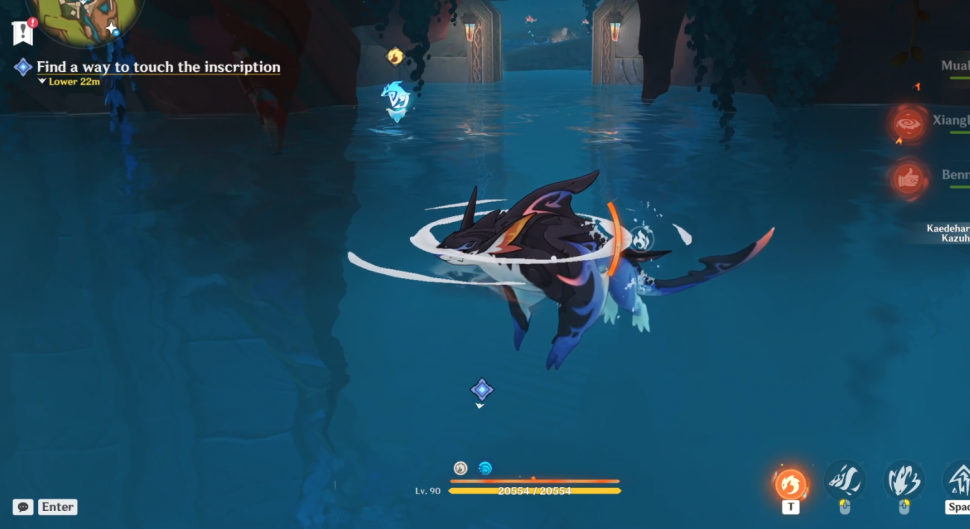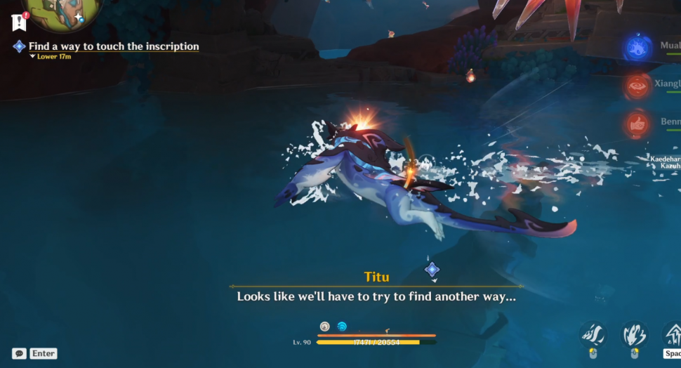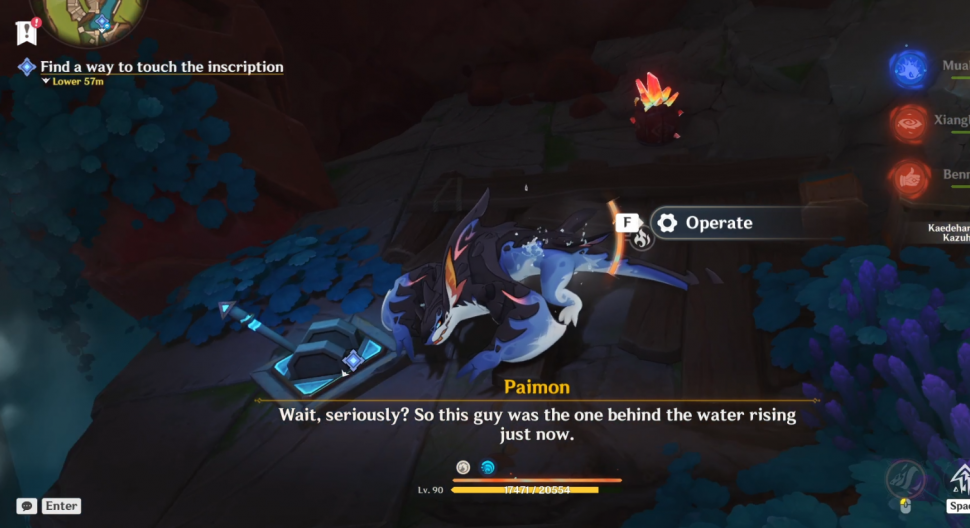 Когда вода закончит подниматься, посмотрите на север и увидите дверь. Пройдите в дверь и увидите хилихурлов, возившихся с выключателем. Победите хайлихурлов и снова задействуйте переключатель, чтобы немного снизить уровень воды (так как после этого переключатель будет сломан).