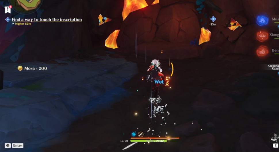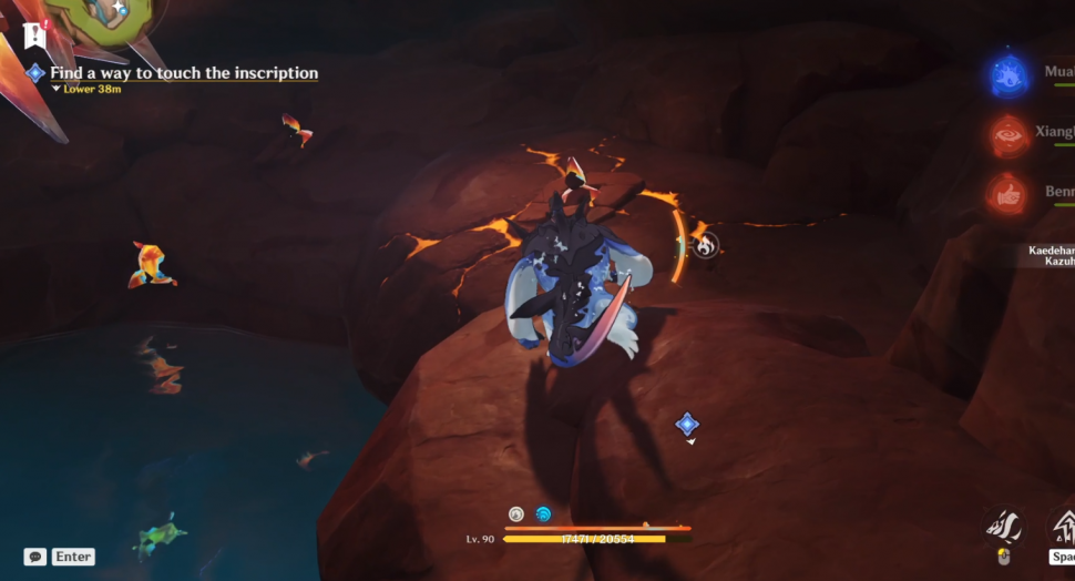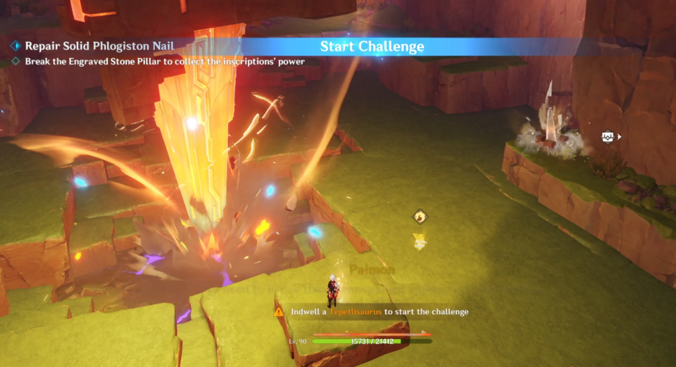 Но прежде всего вселитесь в Тепетлизавра, подойдите к разрушаемой скале, как обведено на картинке выше, и разбейте ее. За ним будет расплавленная трещина. Войдите в расплавленную трещину, чтобы подняться еще выше.