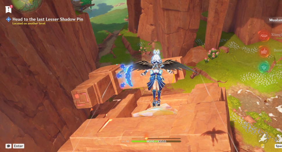 Идите по тропинке, и вы увидите еще одну разрушаемую скалу. Разрушьте его и пройдите через него, чтобы взаимодействовать с надписью. Когда вы взаимодействуете с надписью, она автоматически поднимет вас на Путь духов и приведет к лестнице. Отсюда просто следуйте за надписью обратно в Малый Теневой Штырь.