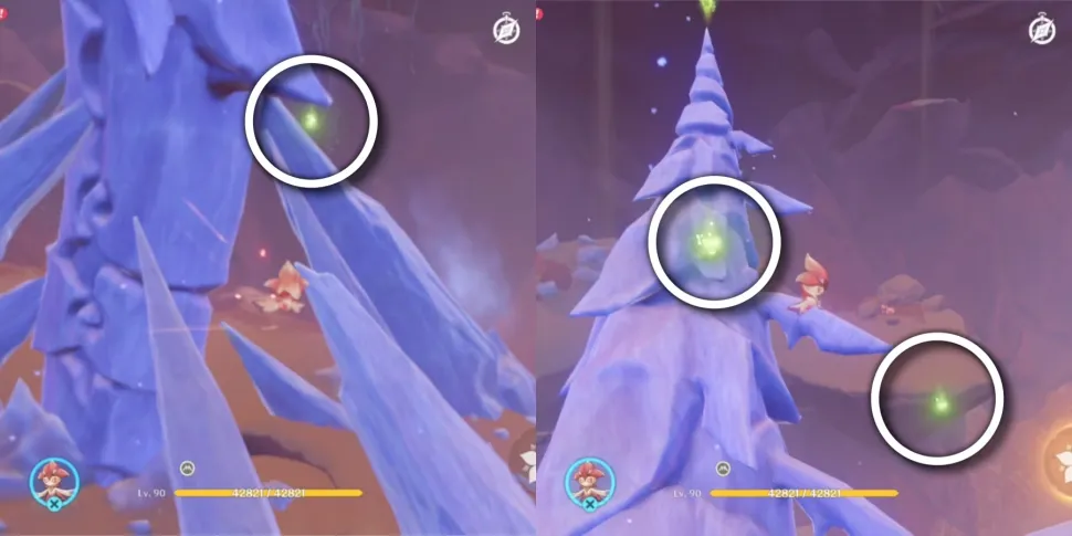 Из предыдущего места следуйте на северо-восток, чтобы найти следующее дерево Фраваши. В этом задании игроки должны собрать три зеленых фрагмента; один из них находится наверху скалы (возле дендрокула), а два других парят вокруг дерева Фраваши.