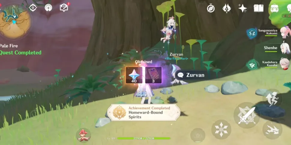 Освободив все остатки Пари с деревьев Фраваши, вернитесь в Зурван, чтобы завершить квест "Бледный огонь" в Genshin Impact. Игроки получат 40 примогемов и достижение Homeward-Bound Spirits.