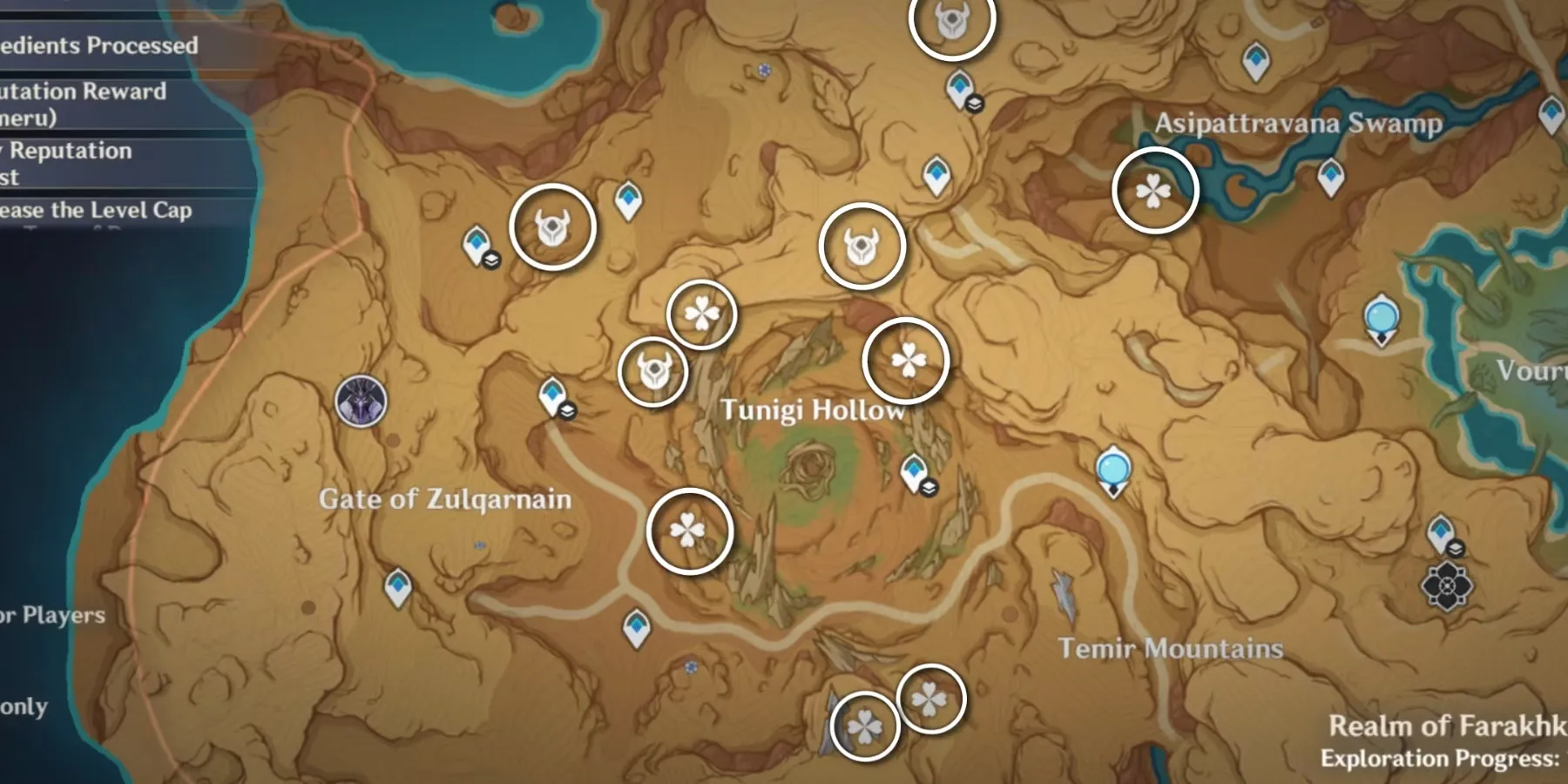 Расположение деревьев Фраваши для квеста "Бледный огонь" в Genshin Impact