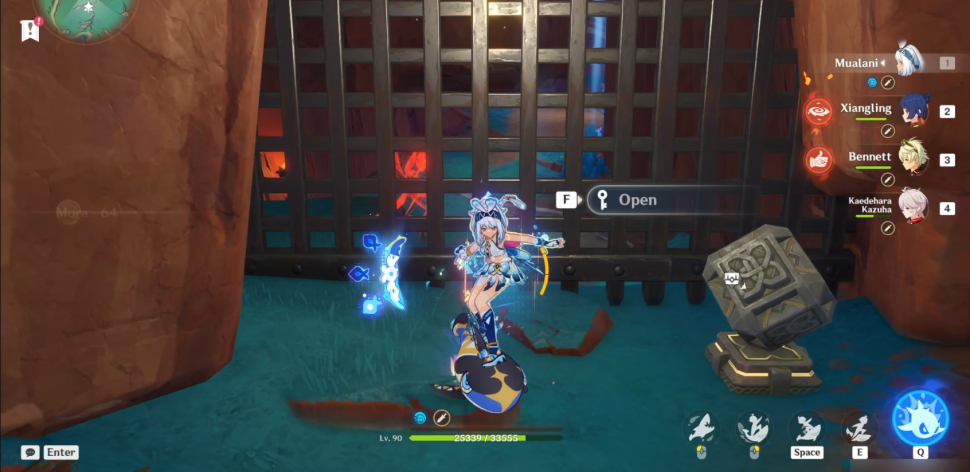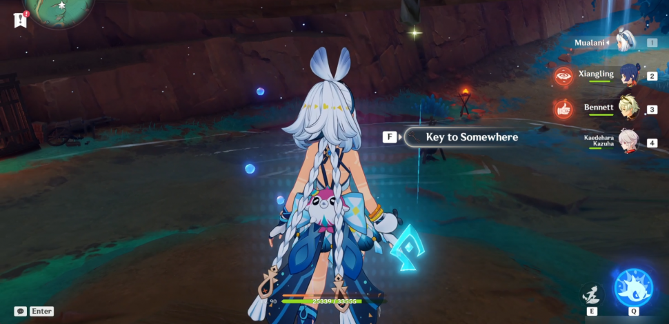 Второй ключ находится на свисающей веревке также прямо перед запертыми воротами. Заберитесь на ящик, и вы сможете взаимодействовать с блестящим предметом на веревке. Как только вы получите два ключа, откройте дверь и следуйте за красной тенью к агенту Фатуи Пиро.