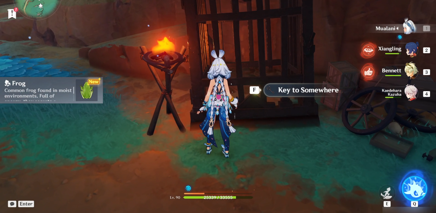 Второй ключ находится на свисающей веревке также прямо перед запертыми воротами. Заберитесь на ящик, и вы сможете взаимодействовать с блестящим предметом на веревке. Как только вы получите два ключа, откройте дверь и следуйте за красной тенью к агенту Фатуи Пиро.