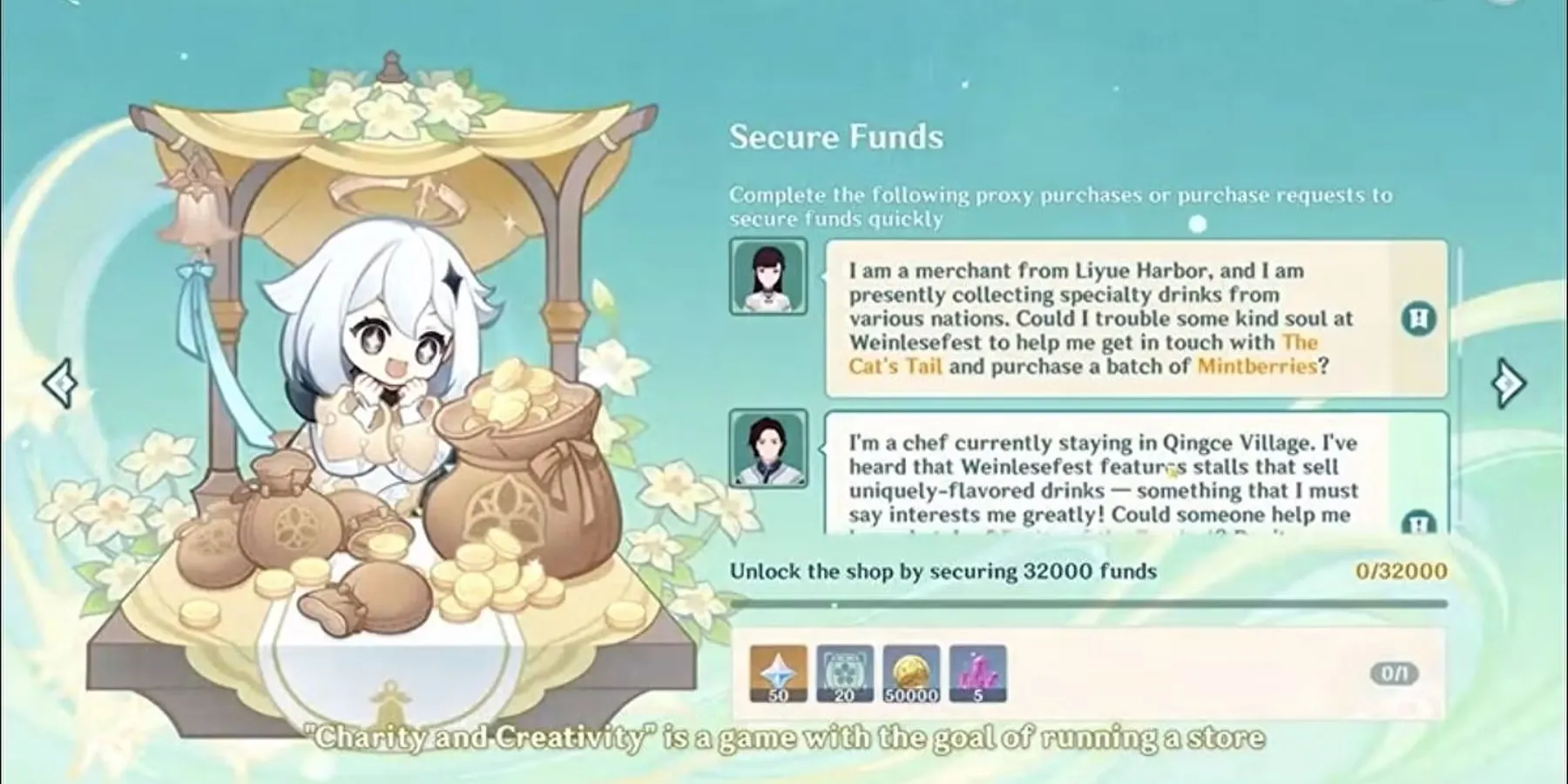 В игре "Благотворительность и творчество" игрокам предстоит торговаться, чтобы собрать необходимые товары и открыть свой собственный благотворительный ларек на фестивале Weinlesefest. На первом этапе игрокам нужно будет собрать предметы, чтобы обменять их на валюту, которая может быть использована для открытия и работы благотворительного киоска. Цель - заработать 32 000 в качестве первоначальных инвестиций для открытия ларька, поэтому игрокам следует собрать и обменять все возможные предметы у продавцов Angel's Share и Cat's Tail в месте проведения Weinlesefest.