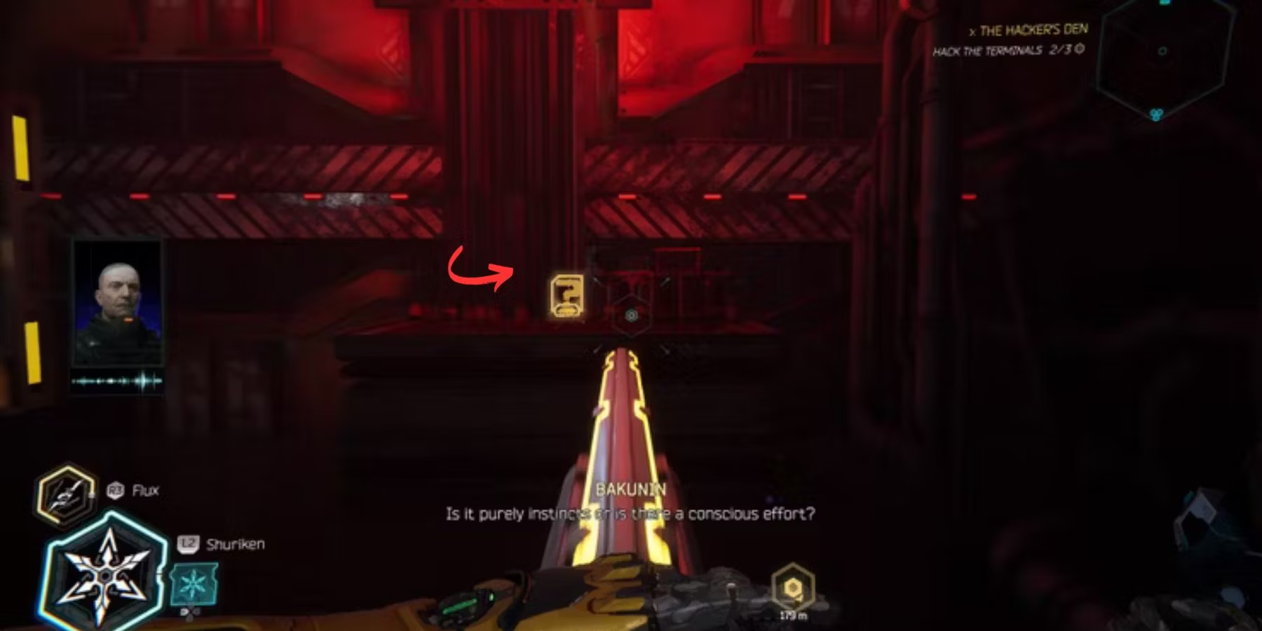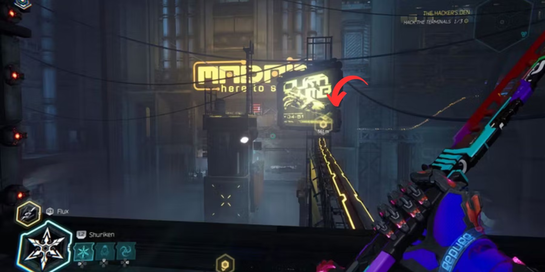 Чтобы получить следующий артефакт, а именно миниатюру Ghostrunner, игрокам необходимо добраться до второго терминала. Для этого нужно с помощью кнопки ускорения снова подняться на крышу, но на этот раз налево, чтобы деактивировать лазерный барьер. После этого пройдите по главному пути и обойдите запертую дверь, используя Shuriken. После уничтожения врагов пройдите через лазеры, чтобы получить миниатюру Ghostrunner.