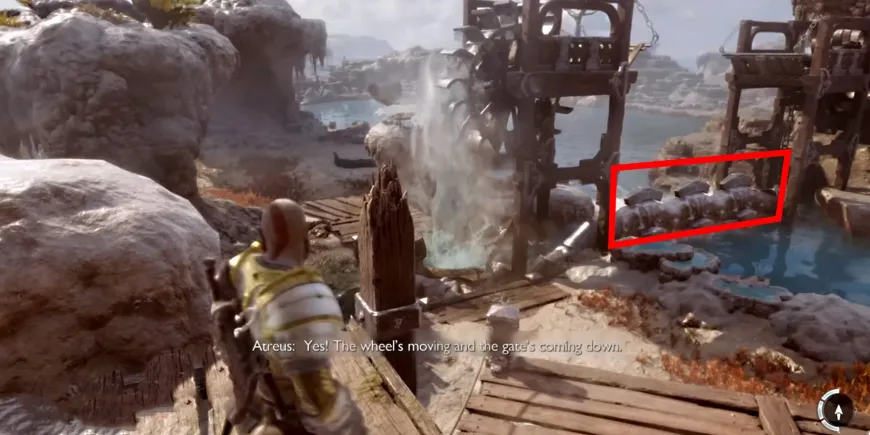 Прежде чем добраться до первых ворот, путь Кратосу и Атреусу преградит большое колесо. Чтобы пройти через колесо, игроки должны добраться до берега рядом с ним.
