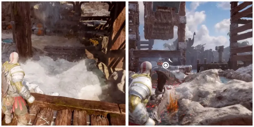 Теперь начинается самое сложное, когда Кратос доберется до гейзера под стальным блоком. Заморозьте воду и перепрыгните на другую сторону, затем победите врагов и найдите спрятанный гейзер под металлической крышкой. Используйте оружие Кратоса, чтобы снять крышку.