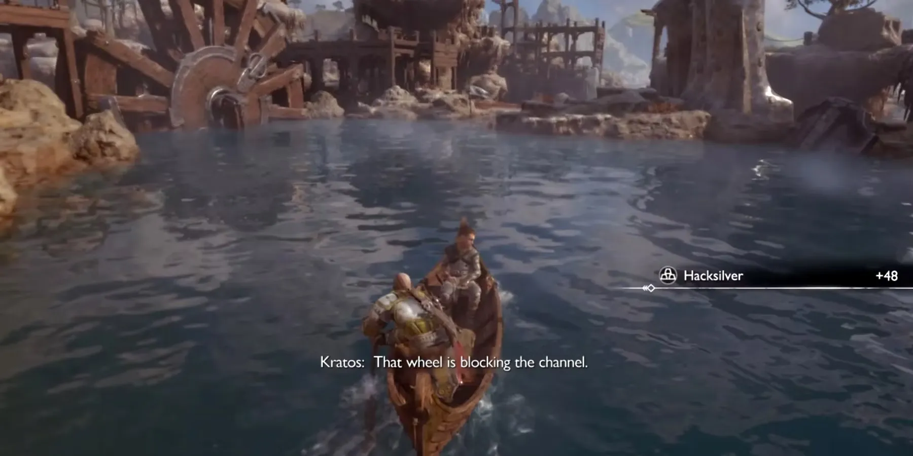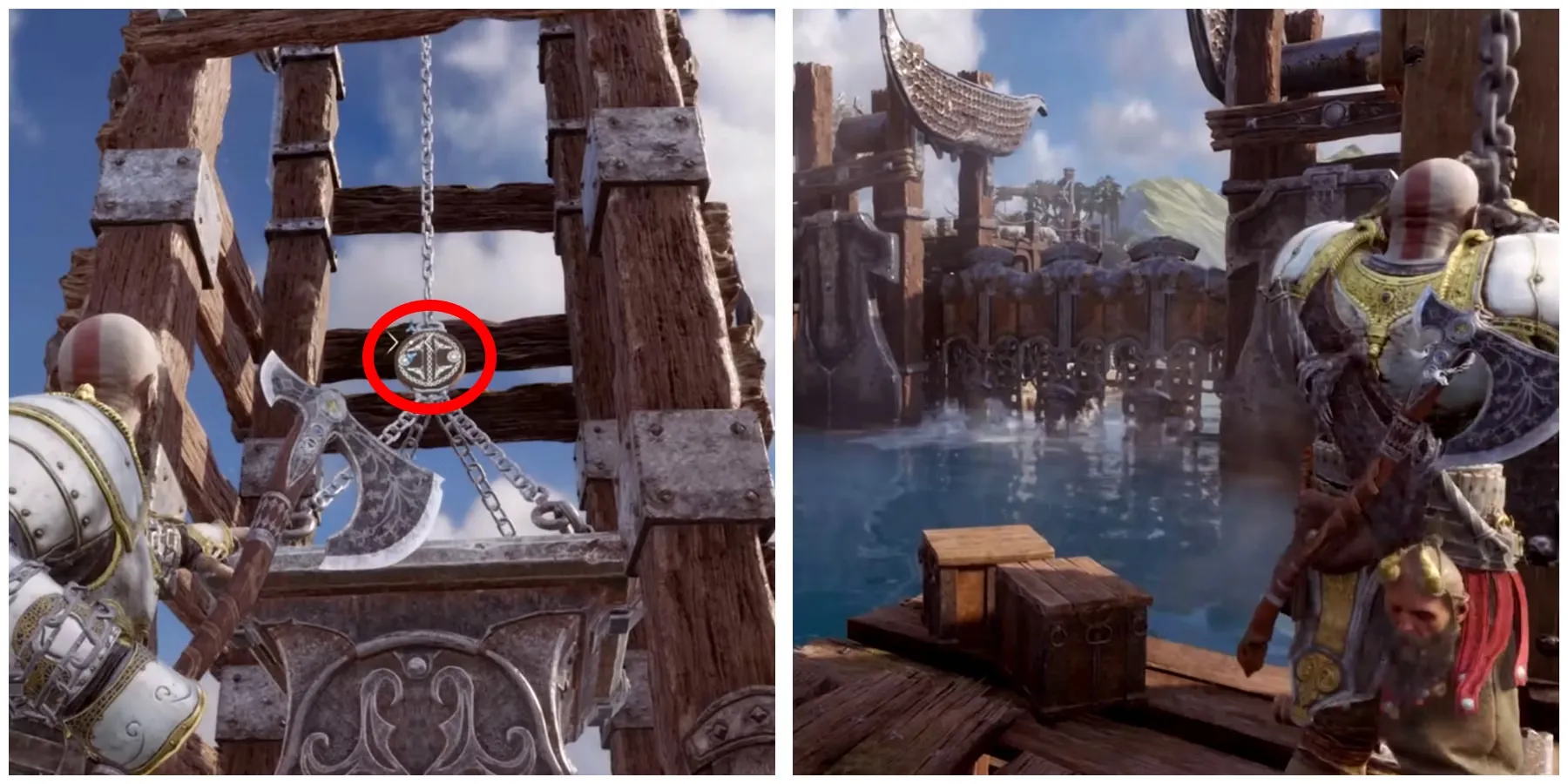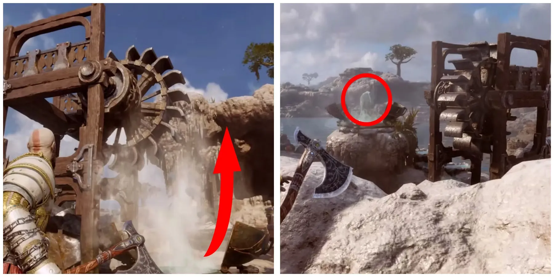 Прежде чем добраться до первых ворот, путь Кратосу и Атреусу преградит большое колесо. Чтобы пройти через колесо, игроки должны добраться до берега рядом с ним.