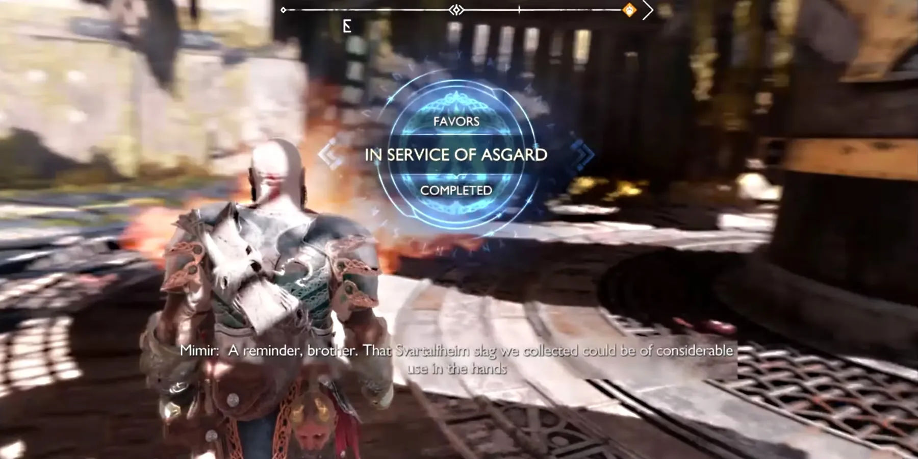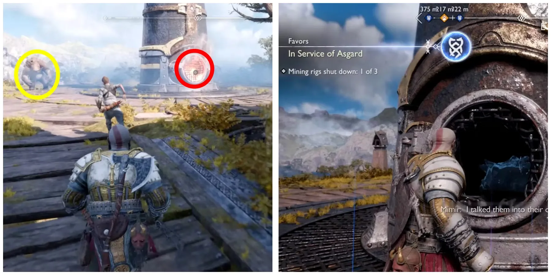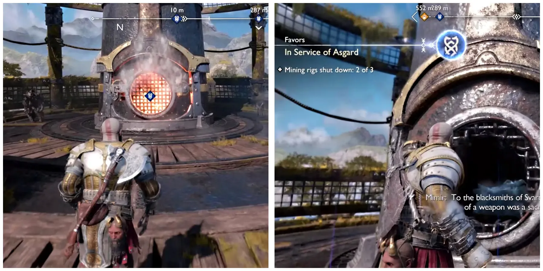 Чтобы получить квест In Service Of Asgard Favor, игроки должны добраться до деревни Нидавеллир и продвинуться в главном квесте. Дойдя до второй части деревни, они могут встретить Раеба, который даст Кратосу и Атреусу квест Favor, чтобы очистить три буровые установки.