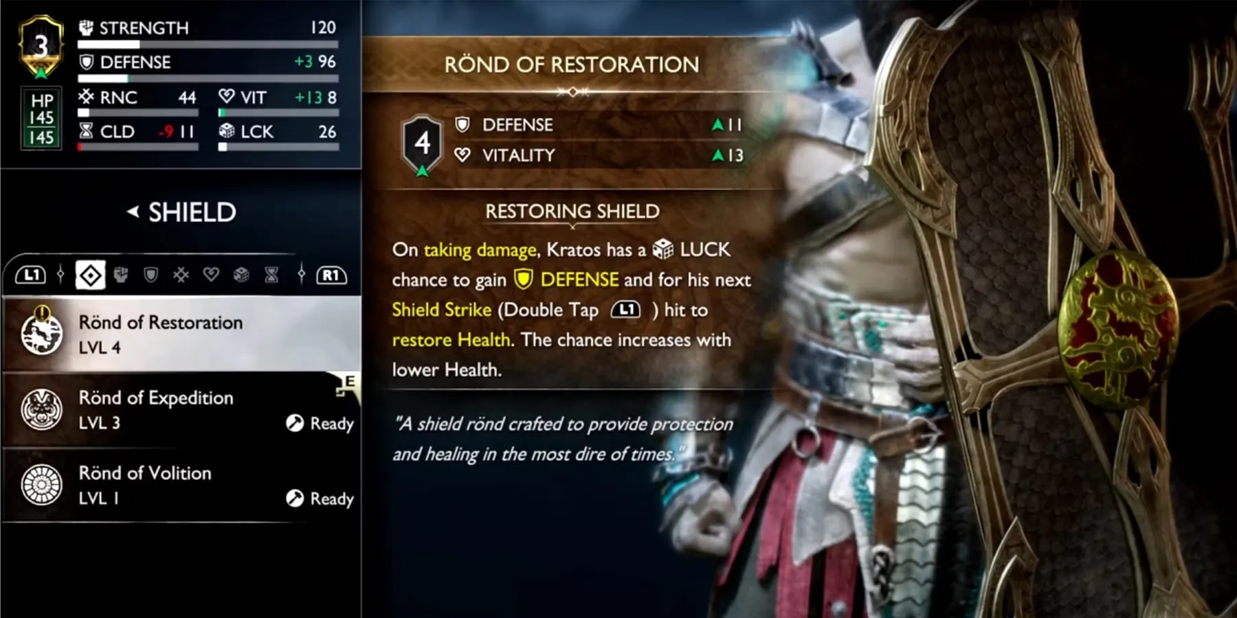 Rond of Restoration - это щит четвертого уровня в God of War Ragnarok, который дает 11 защиты и 13 жизненной силы. Согласно игре, он создан с целью обеспечить защиту и исцеление в самых сложных ситуациях. При этом Rond of Restoration дает шанс восстановить здоровье при использовании щита для удара (двойное нажатие L1) и дополнительный прирост защиты при получении урона.