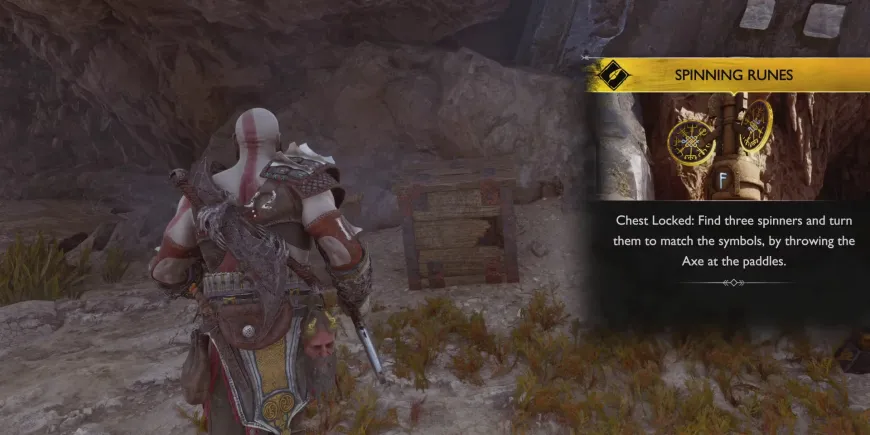 Чтобы открыть его, игрокам нужно найти три вращающихся устройства с круглыми лопастями по бокам. Если бросить топор Левиафана в эти лопасти, устройство повернется и изменит отображаемую на нем руну. Игрокам нужно будет поворачивать каждое устройство до тех пор, пока на нем не появится одна из рун на боковой стенке сундука, а после выбора всех трех рун сундук будет разблокирован.
