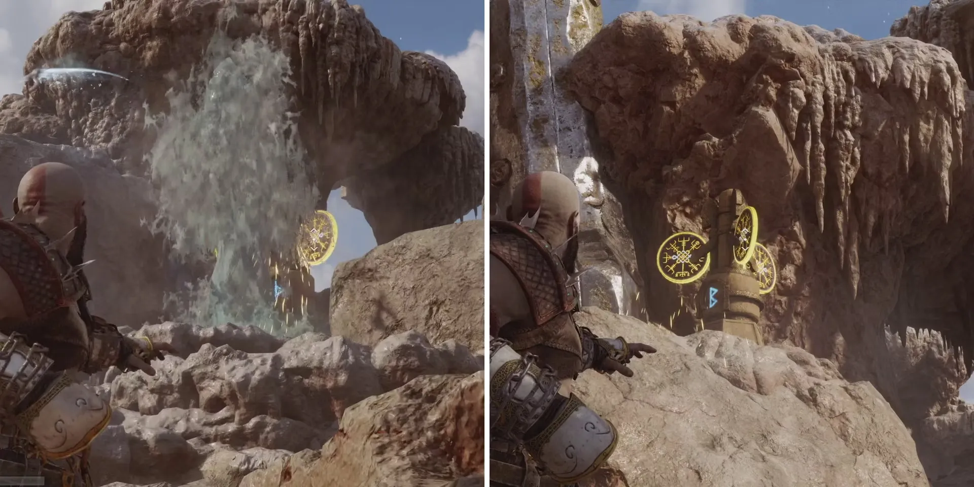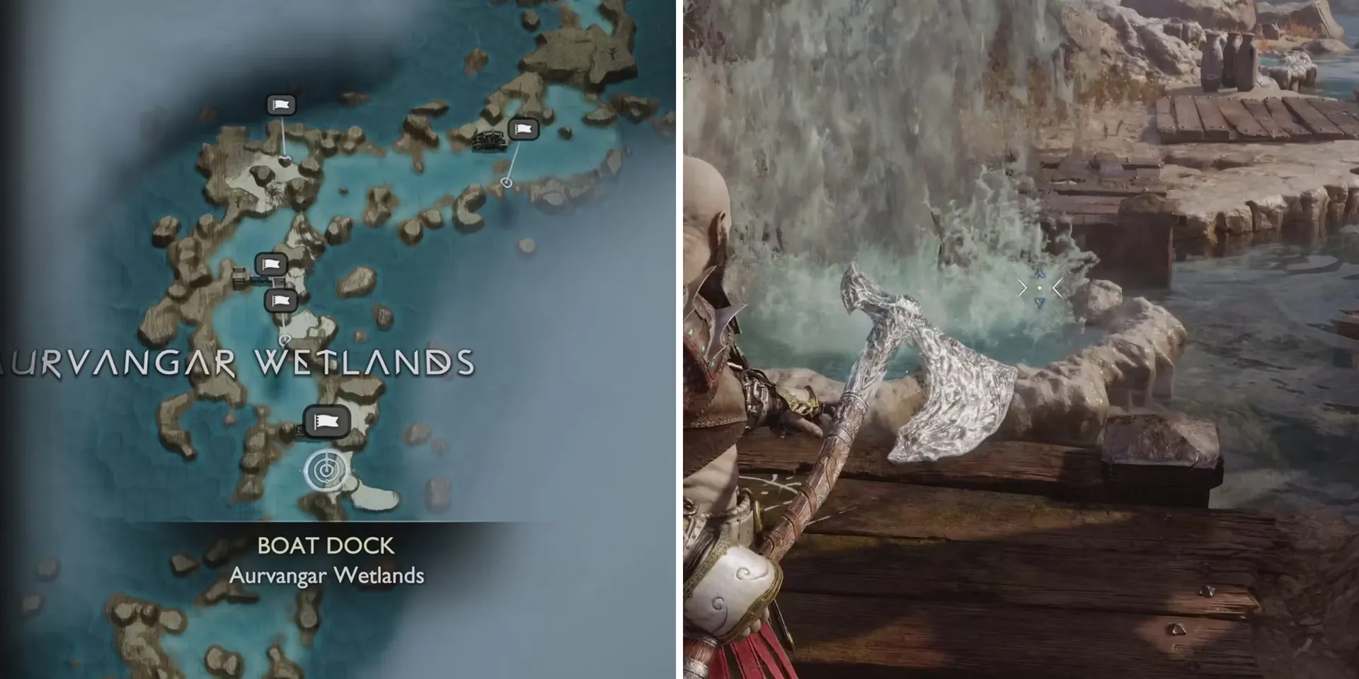 Вскоре после прибытия в водно-болотные угодья Аурвангара в начале главы 2 игроки обнаружат, что путь впереди преграждает большое деревянное колесо. После высадки из лодки в доке с правой стороны путь им преградит гейзер. Чтобы пройти его, нужно заморозить топор Левиафана, удерживая треугольник, а затем бросить топор в гейзер, чтобы заморозить его, что позволит Кратосу и Атрею перепрыгнуть через него.