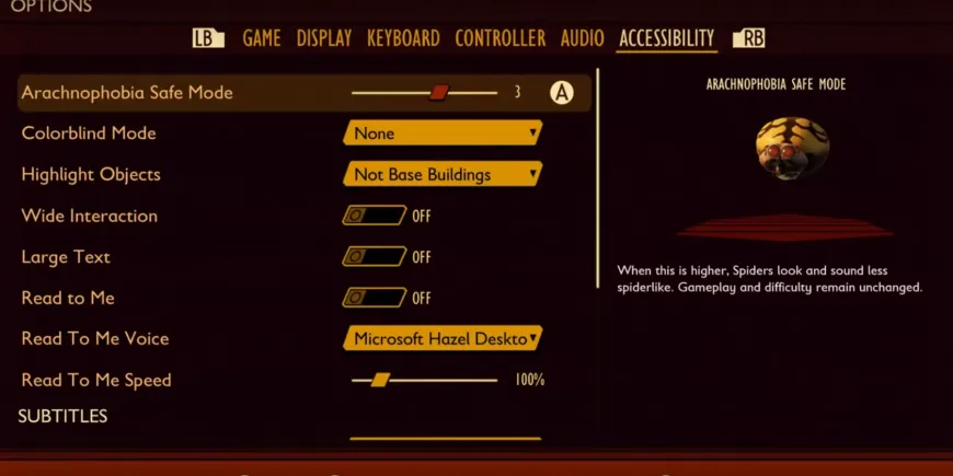 Игроки могут активировать безопасный режим "Арахнофобия" в меню опций игры Grounded на вкладке "Доступность". Она находится в верхней части меню, над другими функциями доступности, такими как субтитры, режим для дальтоников и вспомогательный экранный сканер.