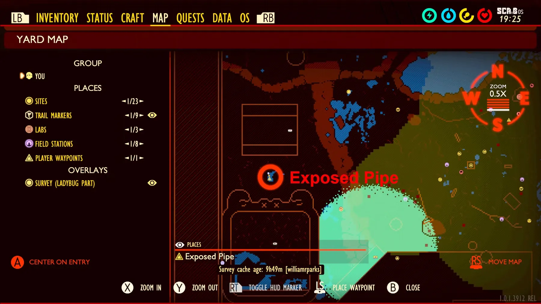 С костяным кинжалом или кинжалом Паучьего Клыка в руках игроки должны добраться до Открытой трубы, которая находится над небольшим водоемом между песочницей Grounded и столом для пикника. Игроки могут увидеть расположение этой трубы, отмеченное на следующей карте, и должны войти в нее по прибытии. После входа в Открытую трубу игрокам следует углубиться в нее, чтобы добраться до еще одной трещины, погрузиться, доплыть до Мокрых корней и очистить их, чтобы получить ключ к Лабиринту Минотавра.