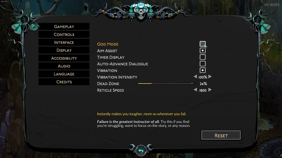 Режим бога работает следующим образом: как только вы включите его, вы сразу же получите снижение урона на 20 %, а также будете получать дополнительные 2 % каждый раз, когда умрете во время одного из забегов. Снижение урона достигает 80 %, что делает игру значительно менее жестокой. Так что, если игра покажется вам слишком сложной или вас интересует только сюжет, вы всегда сможете включить его и провести время с пользой. Сопротивление урону, накопленное за время прохождения, будет сохранено, даже если вы отключите режим Бога, так что вам не придется начинать игру с нуля.