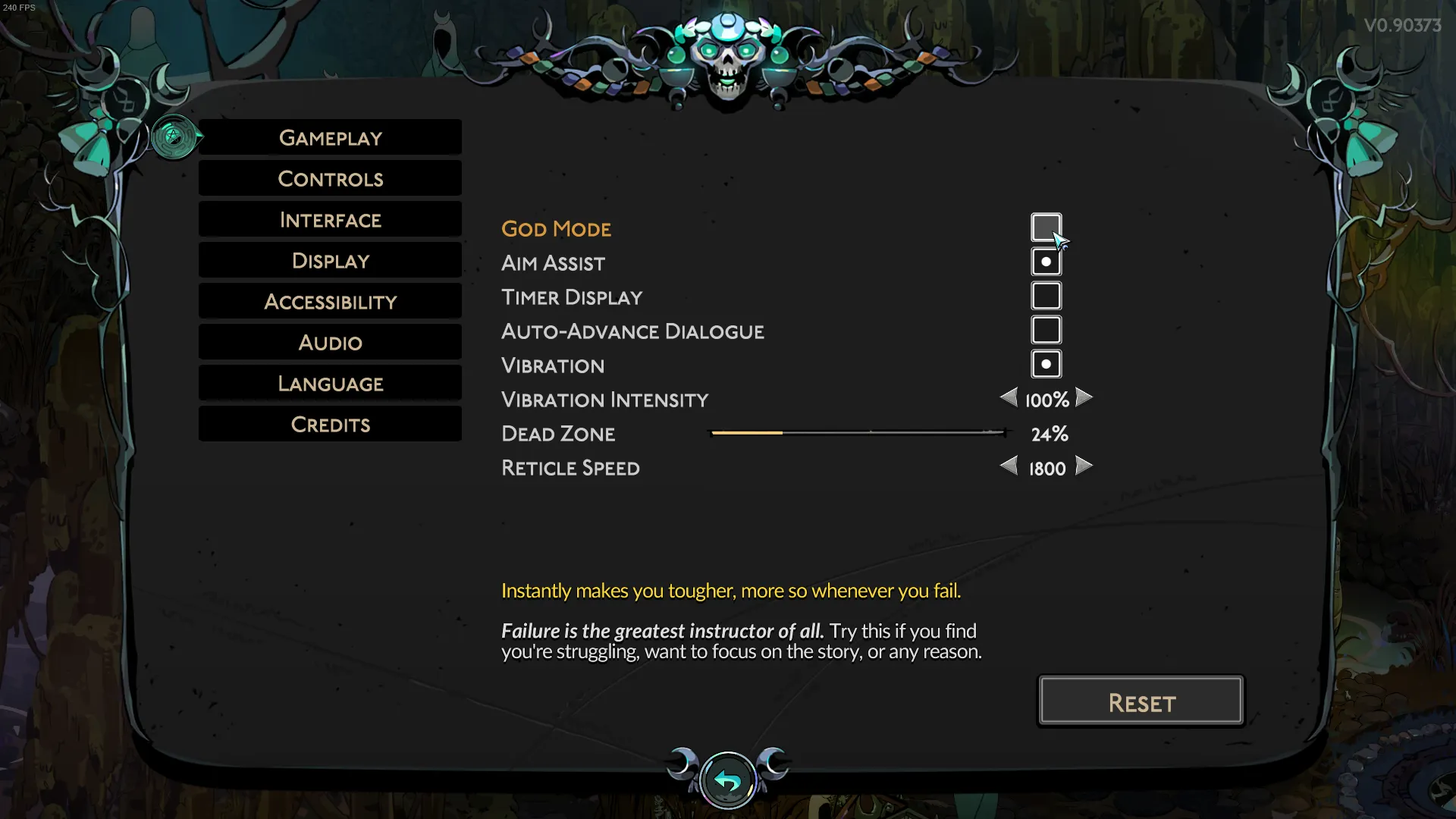Режим бога работает следующим образом: как только вы включите его, вы сразу же получите снижение урона на 20 %, а также будете получать дополнительные 2 % каждый раз, когда умрете во время одного из забегов. Снижение урона достигает 80 %, что делает игру значительно менее жестокой. Так что, если игра покажется вам слишком сложной или вас интересует только сюжет, вы всегда сможете включить его и провести время с пользой. Сопротивление урону, накопленное за время прохождения, будет сохранено, даже если вы отключите режим Бога, так что вам не придется начинать игру с нуля.