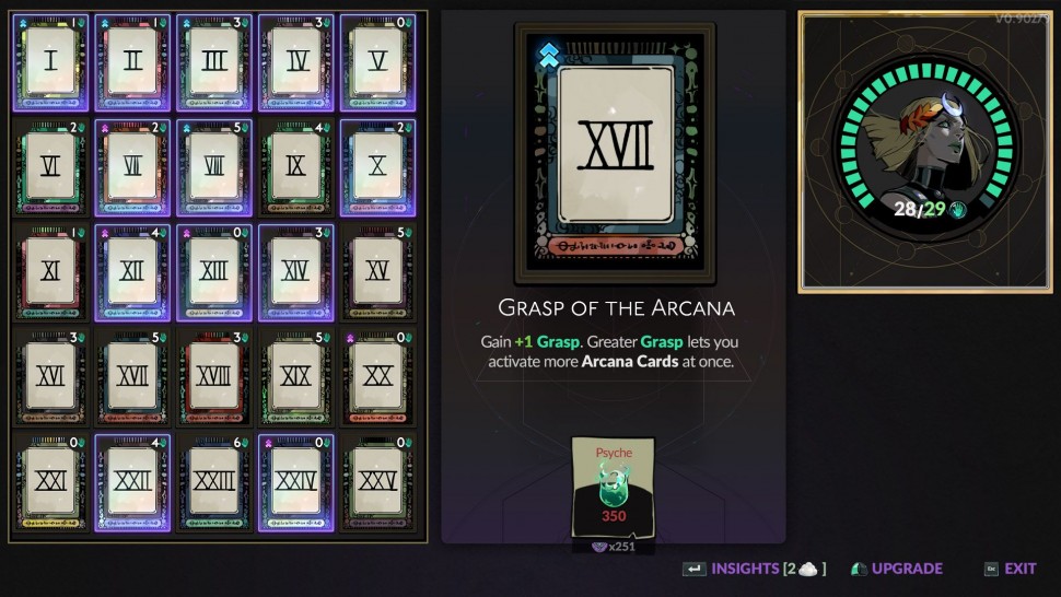Узнав, как работает Хватка, большинство из вас, вероятно, задаются вопросом: «Но как мне на самом деле увеличить свою Хватку, чтобы иметь больше карт арканов, активных одновременно?» И это хороший вопрос. Здесь на помощь приходит Психея. Психика - это ресурс, который Hades 2 использует для увеличения количества хваток, которые вам нужно распределить.